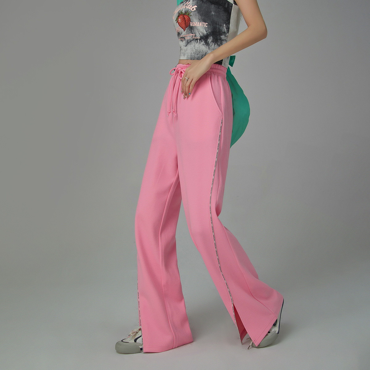 高腰抽绳开衩宽松休闲裤女春秋运动纯色长裤 999827
