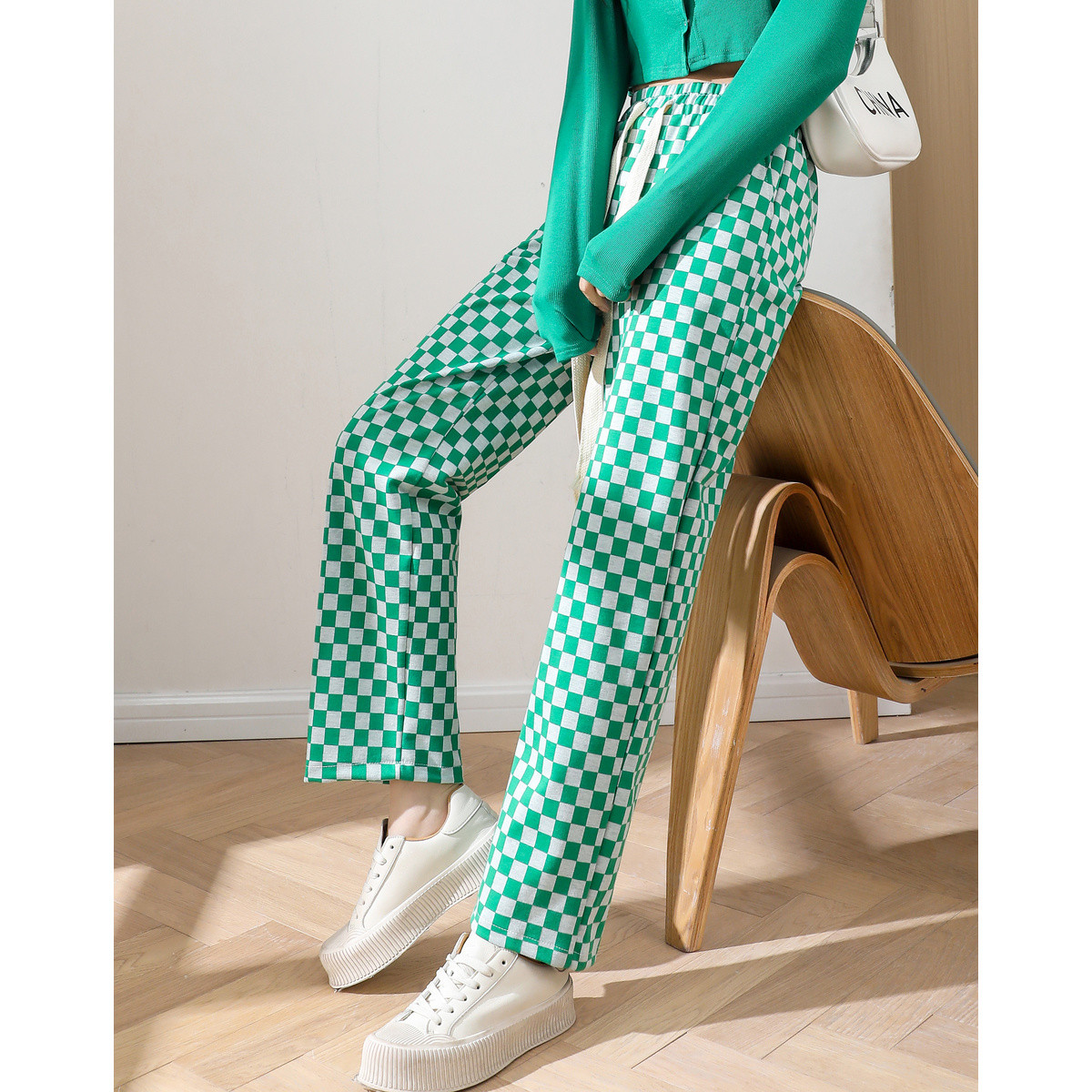 【棋盘格直筒裤】春秋松紧腰女裤拼色长裤子运动休闲裤 333825