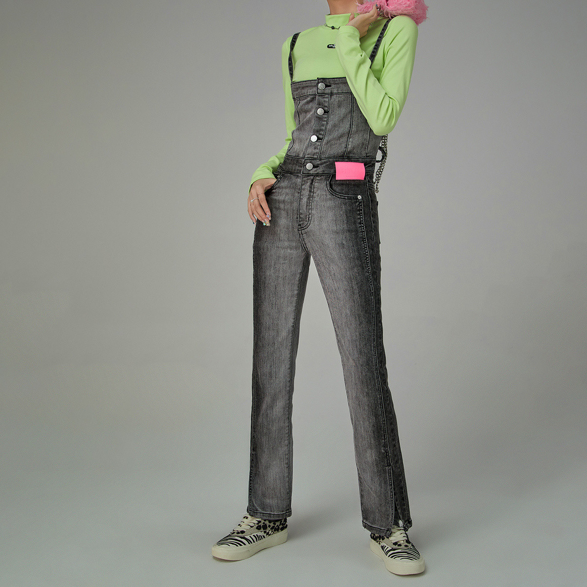 甜辣性感露背背带牛仔裤女春秋时尚潮黑灰渐变长裤子 395411