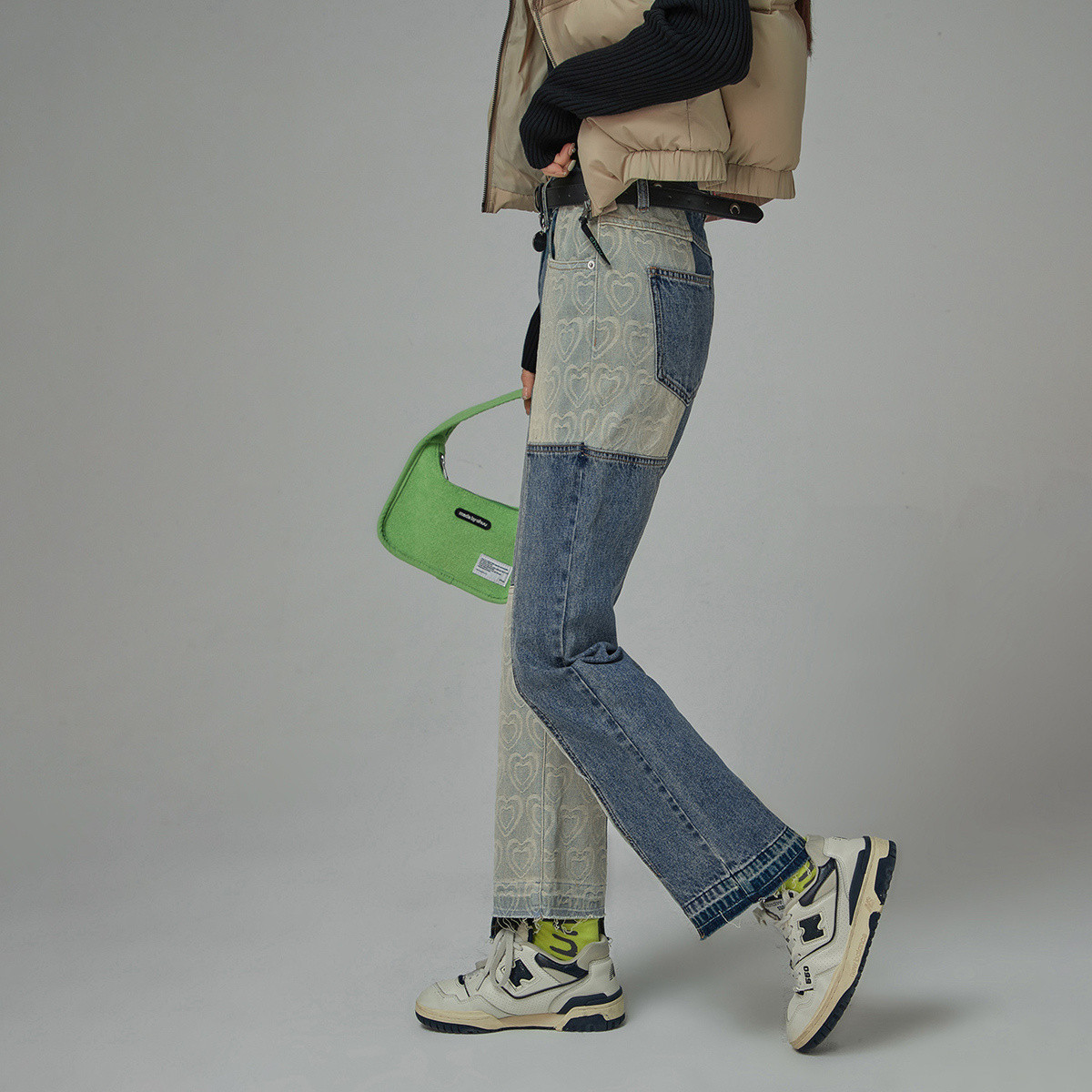 撞色拼接哈伦牛仔裤女春秋高腰设计感直筒九分裤子 492883