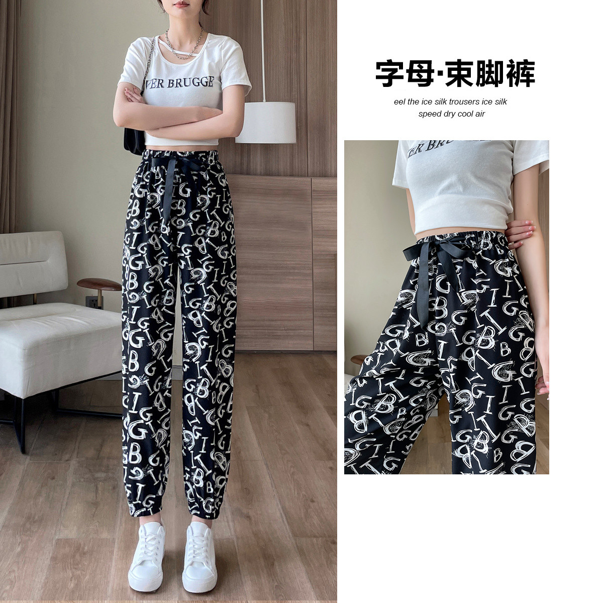 【字母织带束脚裤】夏中腰字母印花微弹薄款女裤子女休闲裤 555841