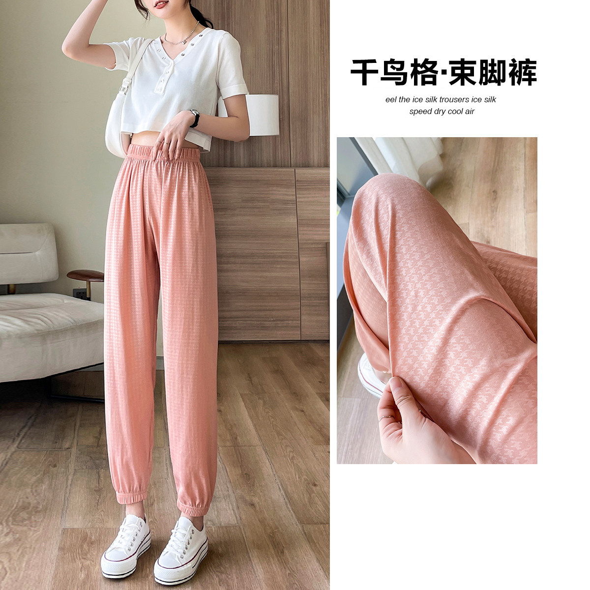【千鸟格束脚裤】夏季中腰松紧女裤薄款裤子女休闲裤 778753