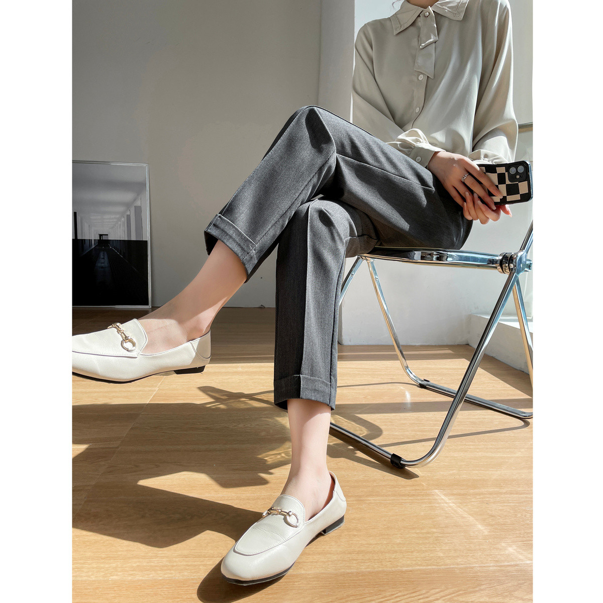 棋盘格高腰直筒休闲裤女春秋季小个子宽松长裤子潮 195283