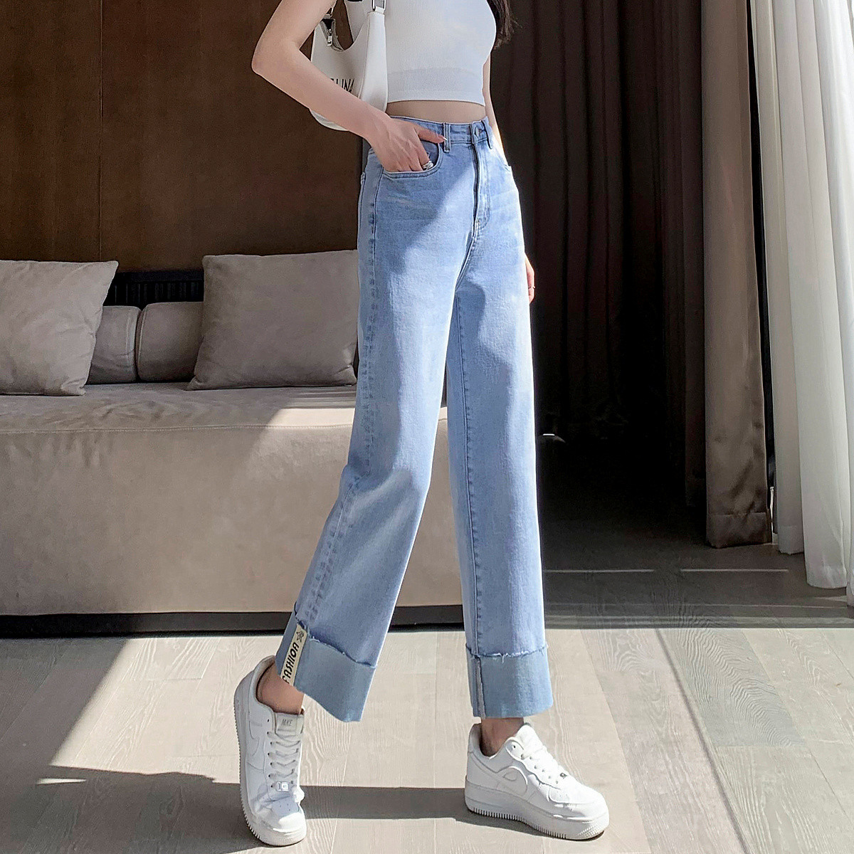 【时尚毛边织带牛仔裤】春秋中腰水洗棉质直筒牛仔裤女 991233