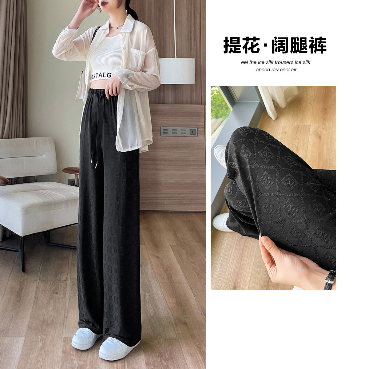 【提花阔腿裤】夏季松紧腰女裤系绳字母裤子女宽松休闲裤 812161