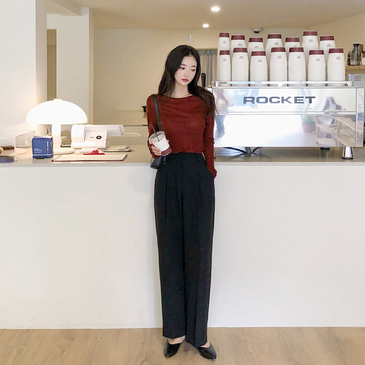 通勤OL风阔腿裤女装时尚简约咖啡色休闲裤子 366476