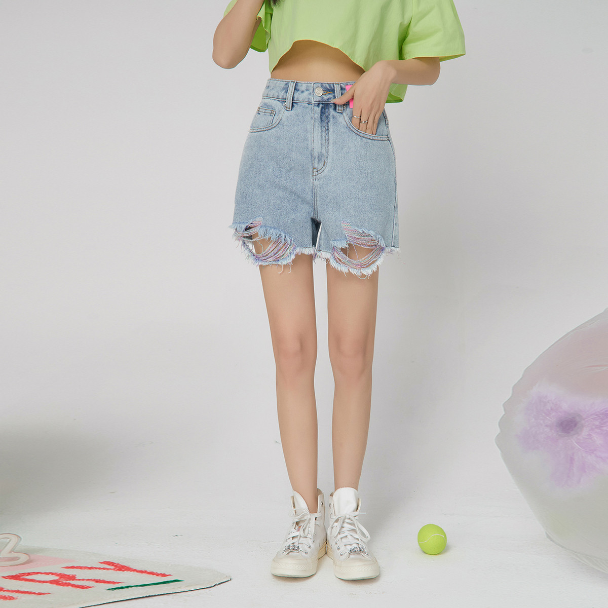 CHUU高腰破洞宽松牛仔短裤女秋韩版贴标显瘦裤子 016787