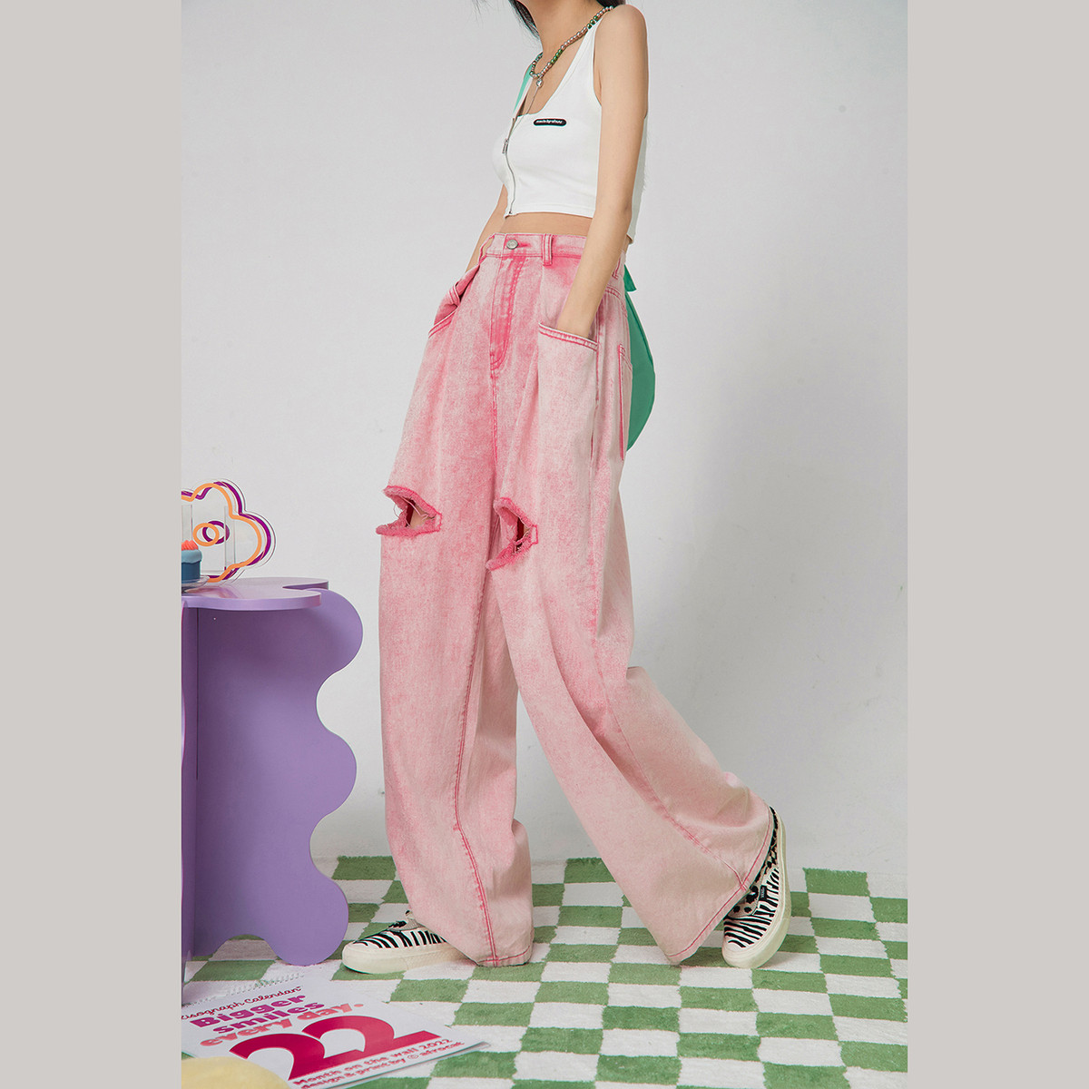 扎染破洞阔腿牛仔裤女春夏秋高腰显瘦宽松拖地长裤子薄 360723