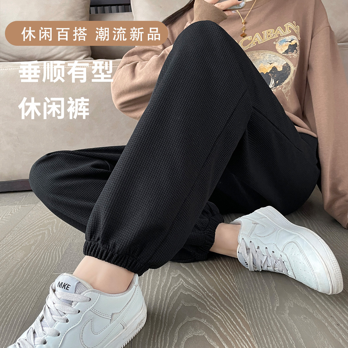 女式休闲裤华夫格春秋日常纯色休闲百搭运动透气舒适青年束腿裤女 669121