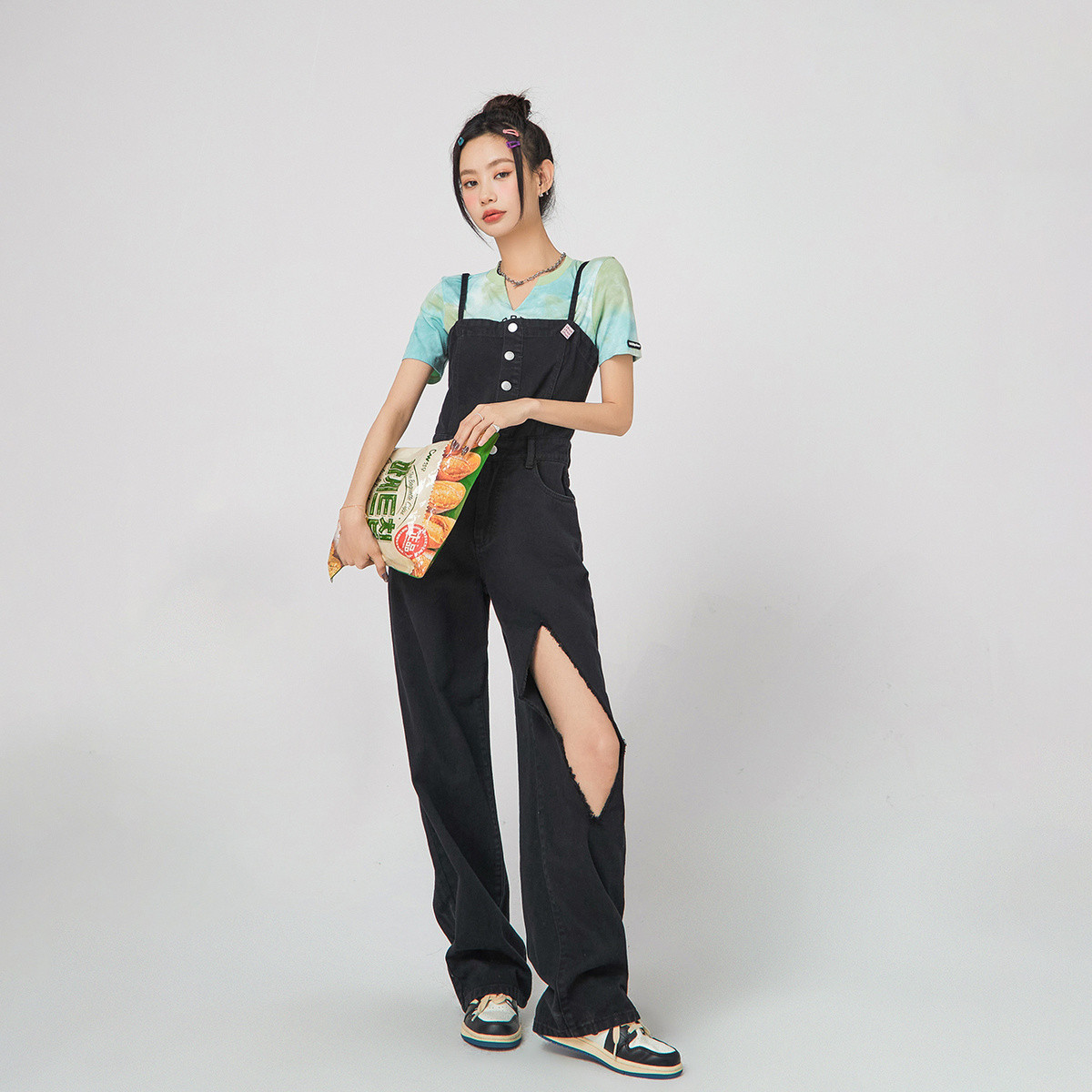 设计感时尚破洞连体牛仔裤女夏季小众个性拖地裤子 815699