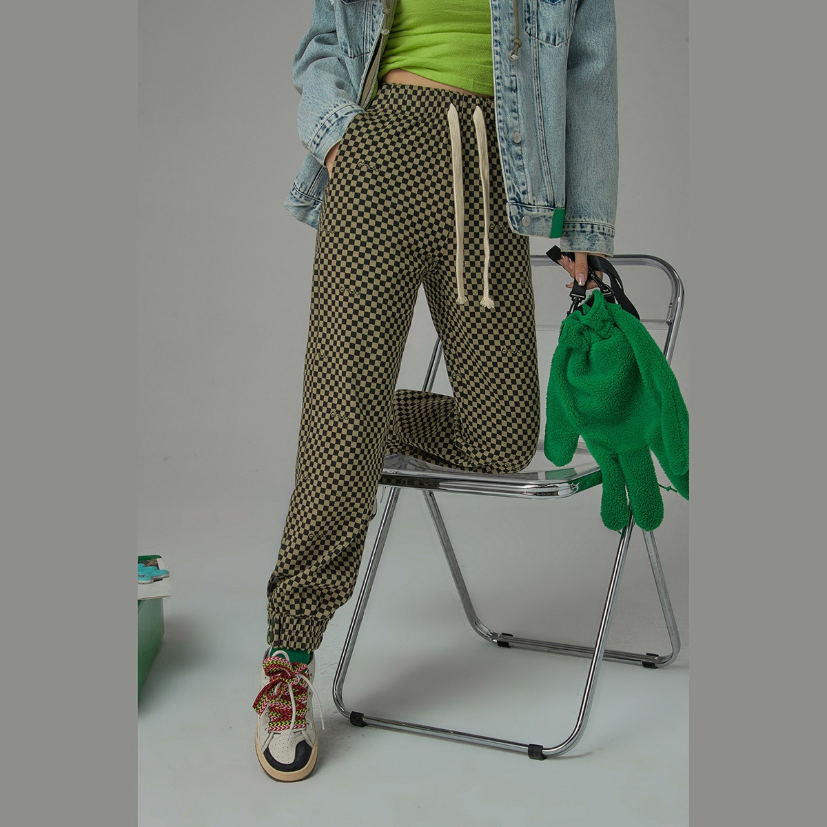 棋盘格束脚休闲裤女春秋垂感显瘦高街ins直筒长裤子 939283