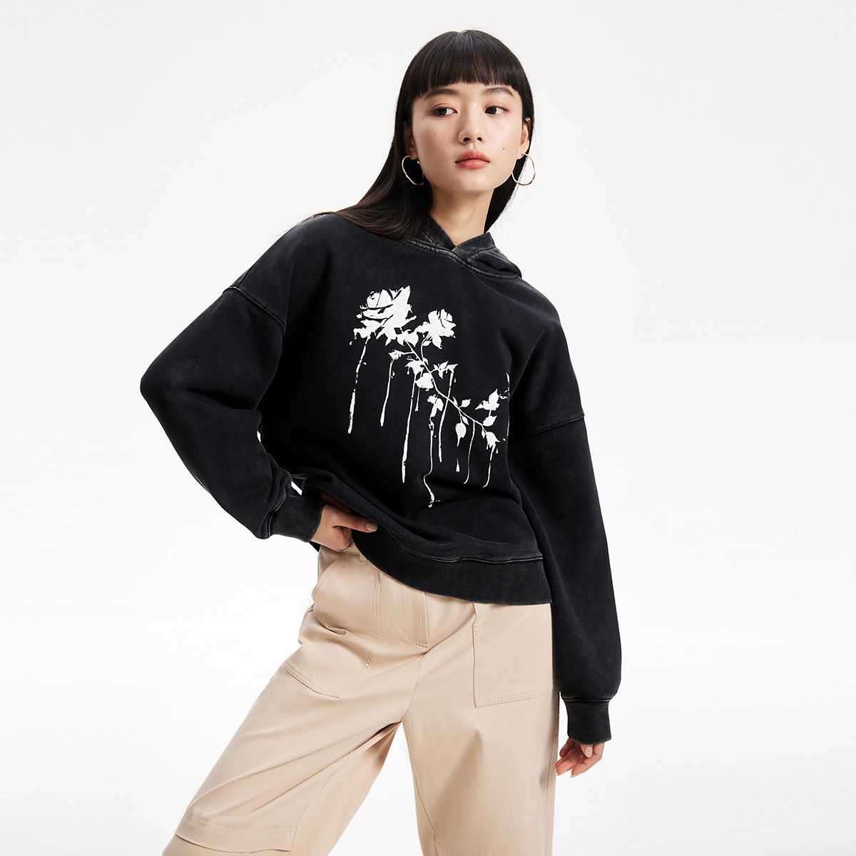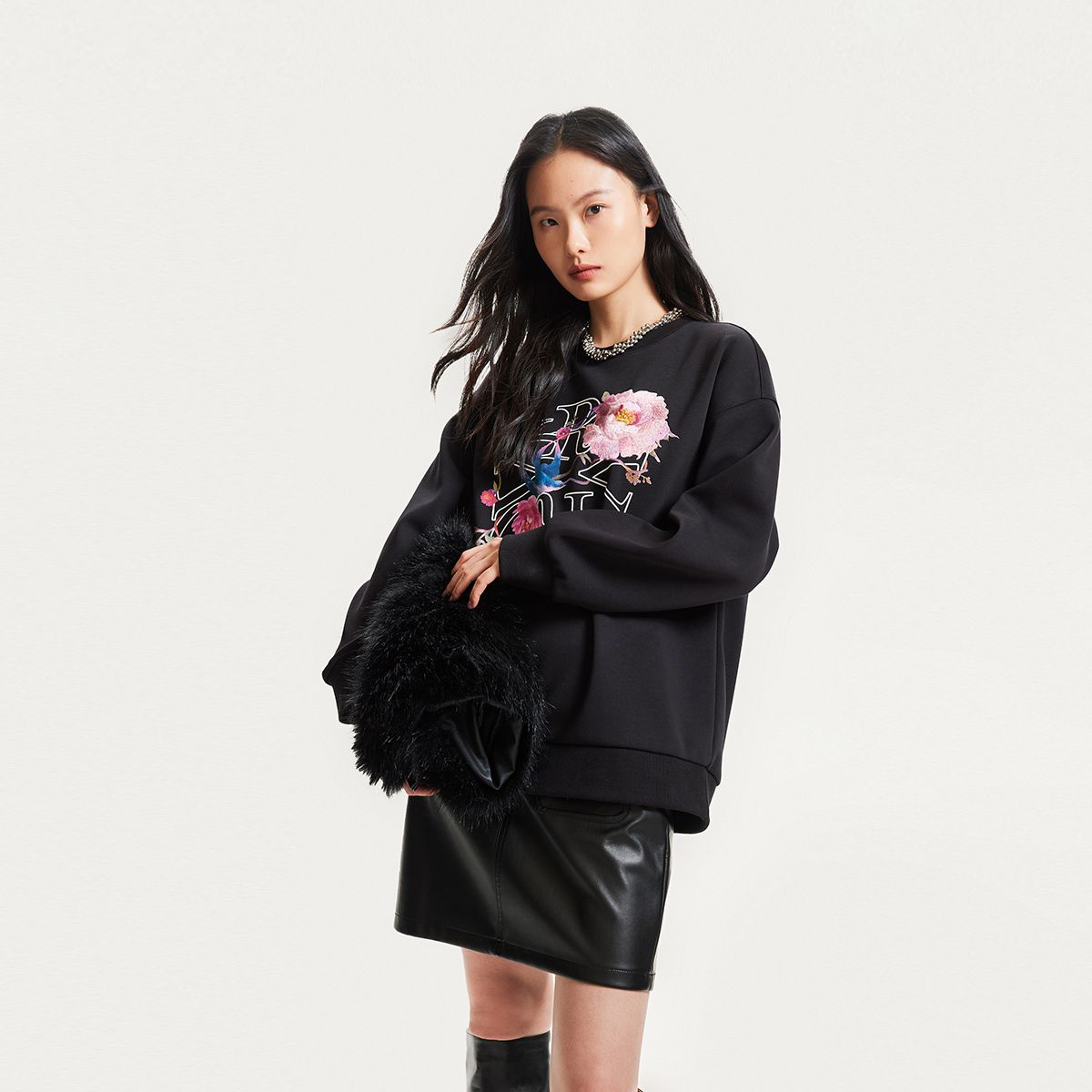 【赵小黎艺术家联名系列】宽松加绒圆领花朵刺绣印花休闲百搭卫衣 068177