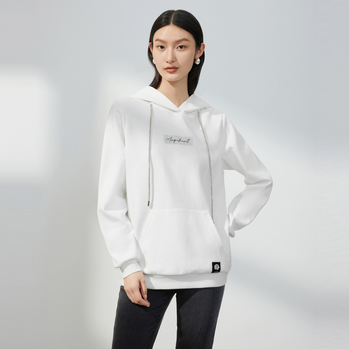 JZ玖姿休闲帽款卫衣女装春季烫钻设计感上衣白色 600524