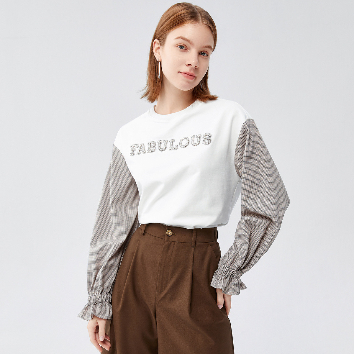 玖姿旗下安娜蔻系列春季舒适圆领时尚拼接花边袖口卫衣女 623308