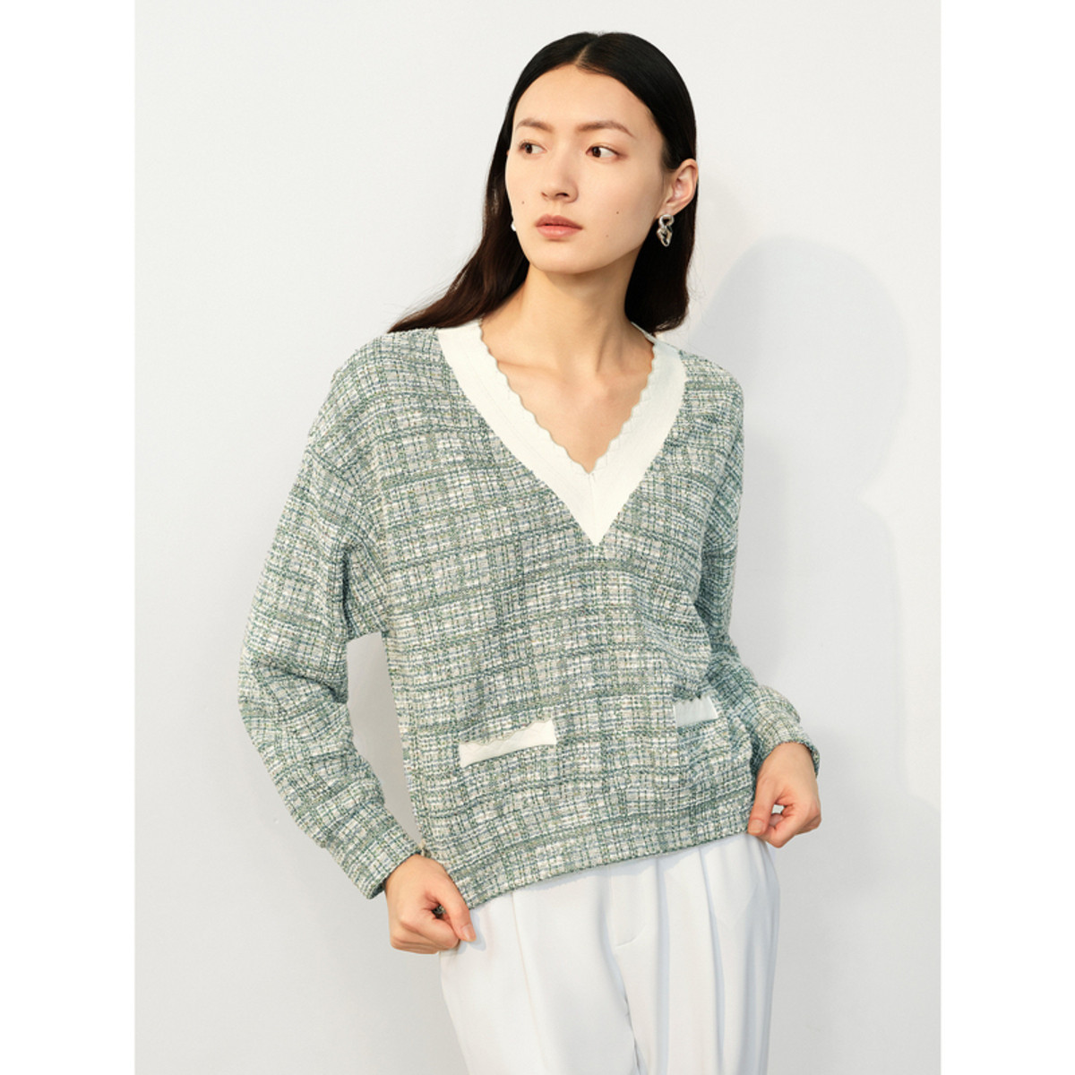 玖姿旗下安娜蔻系列V领复古通勤气质小香风撞色长袖卫衣女秋季 718604