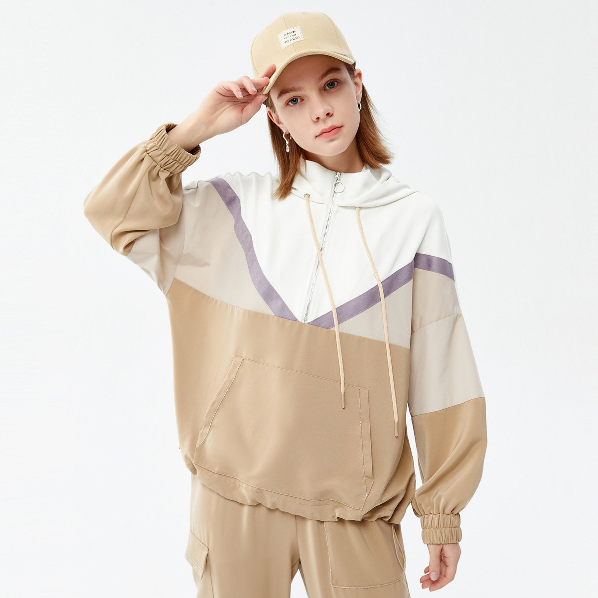 玖姿春时尚通勤拼色拉链休闲系带帽款卫衣 866188