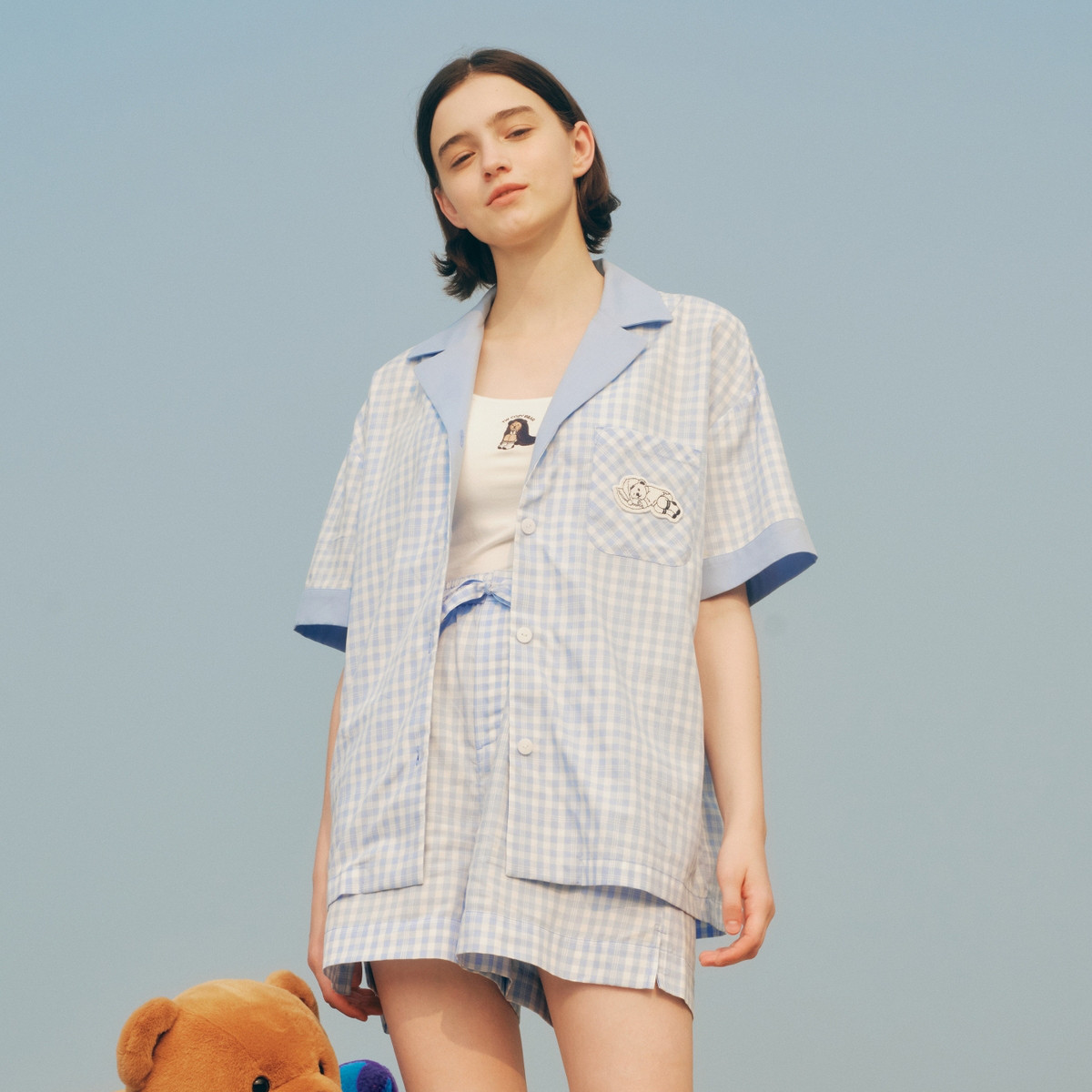 小熊抑菌功能性格纹短套装睡衣莱赛尔家居服女夏 516033