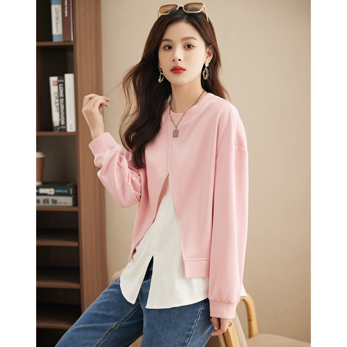 【减龄粉嫩假两件卫衣女】春季百搭舒适不规则显瘦上衣长袖t 412120