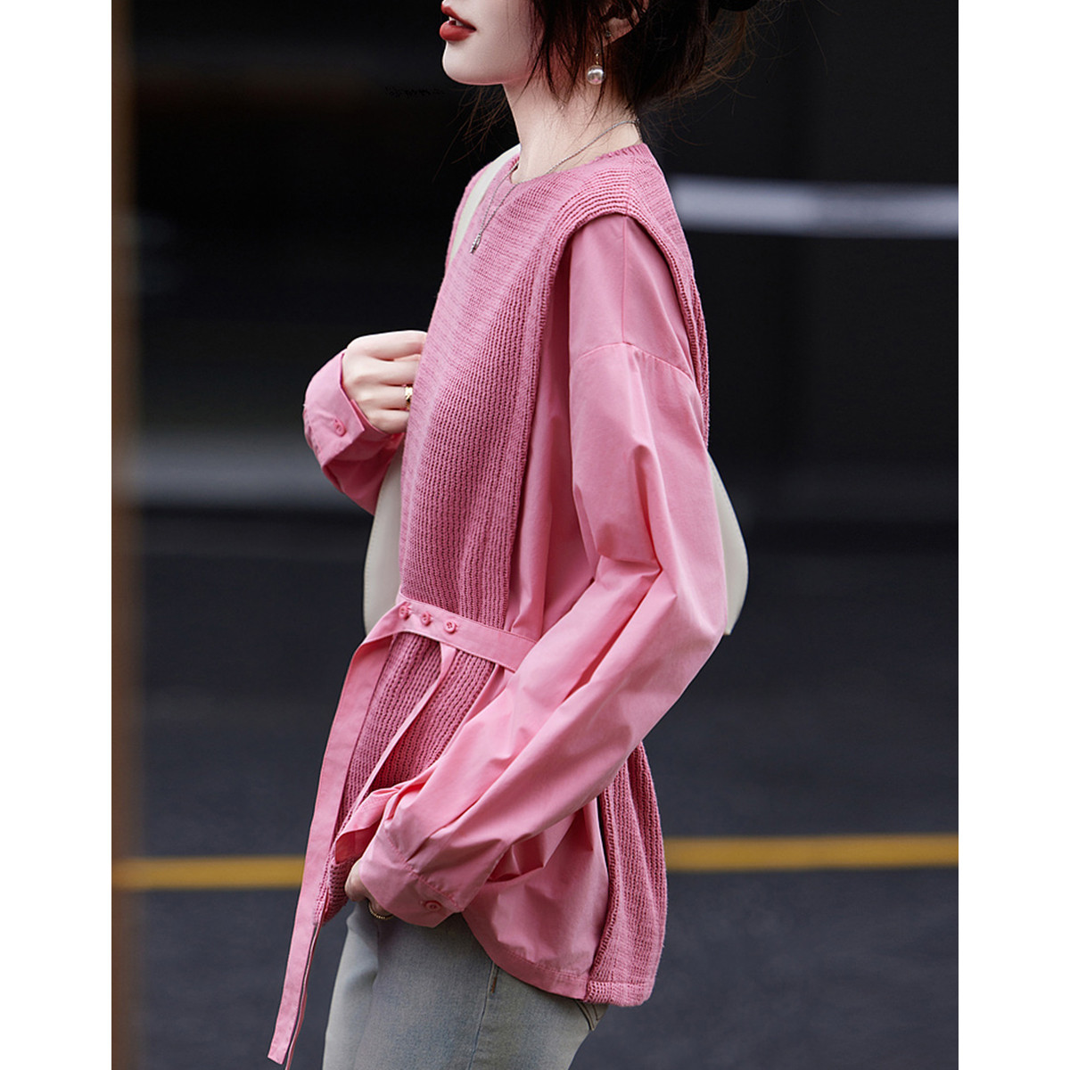 【豆蔻年华】秋简约风圆领拼接上衣可拆卸腰带肌理针织女式卫衣 650433