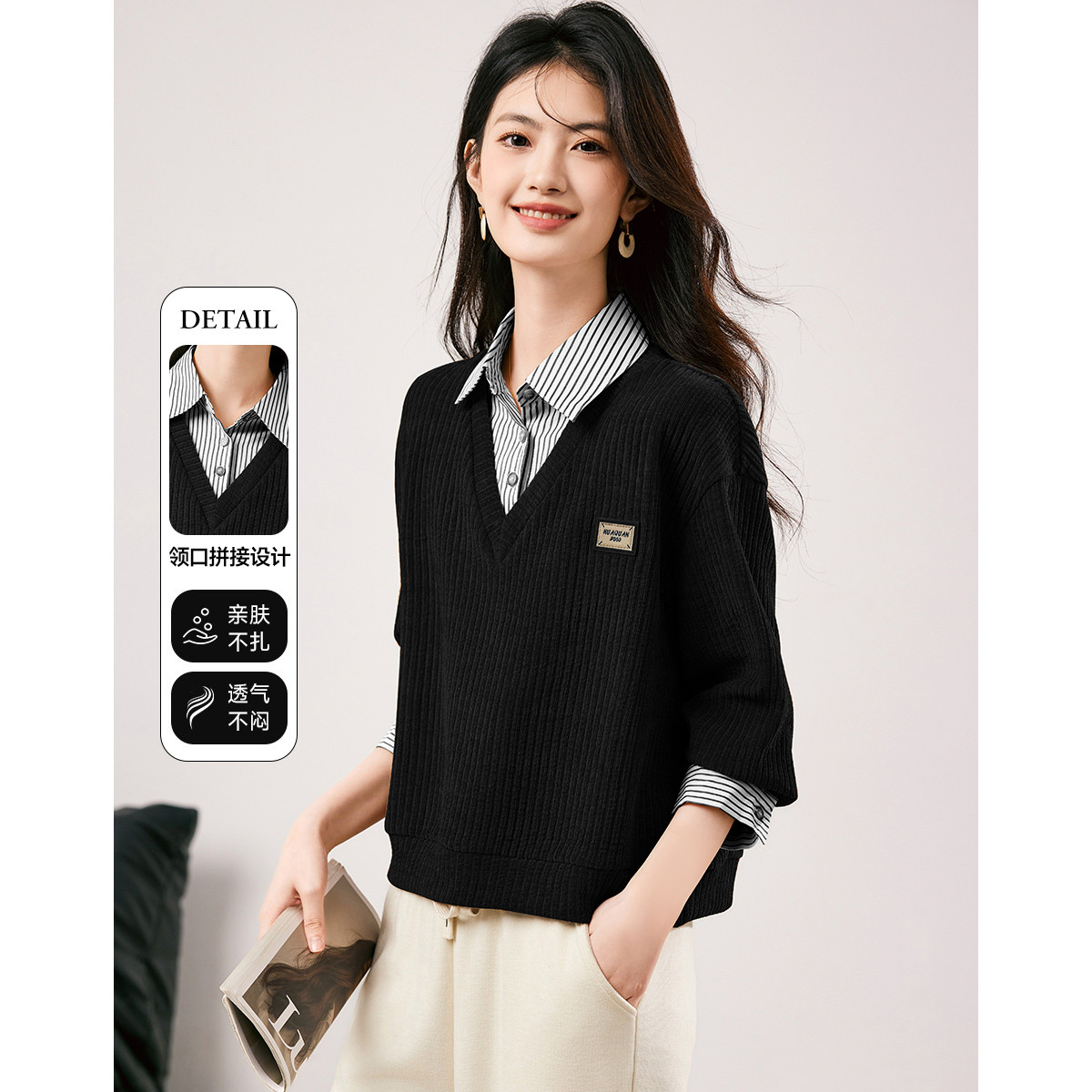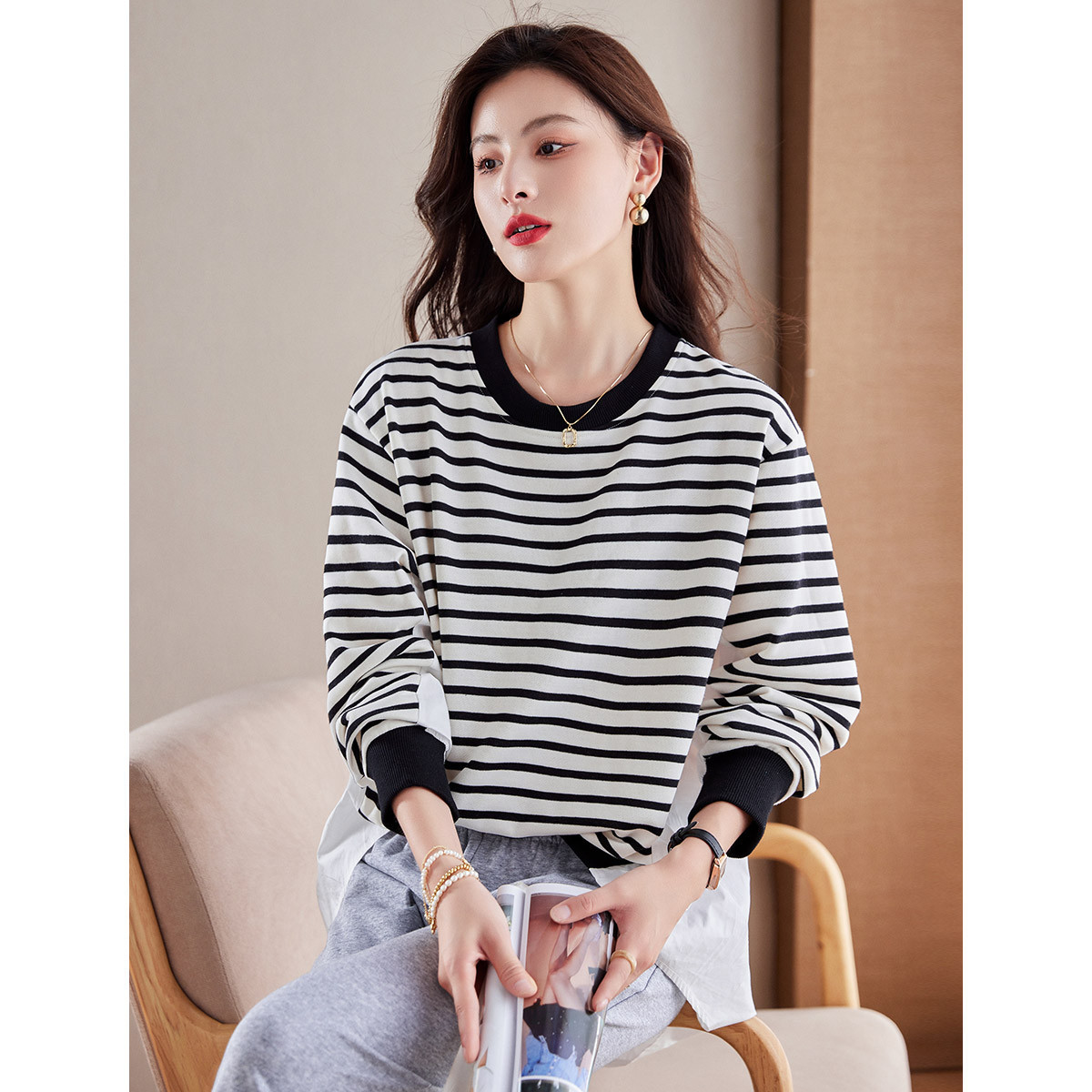【时尚条纹拼接假两件通勤上衣】2025春季新款百搭减龄卫衣女 531480