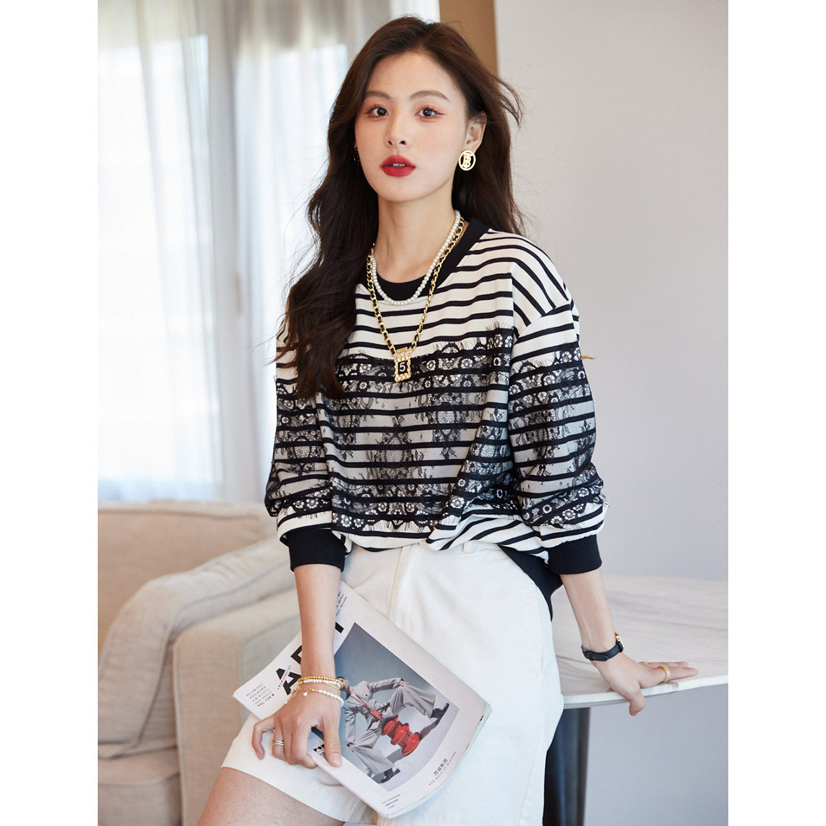 经典条纹拼接圆领女式卫衣时尚舒适ins潮流简约复古式上衣 391640