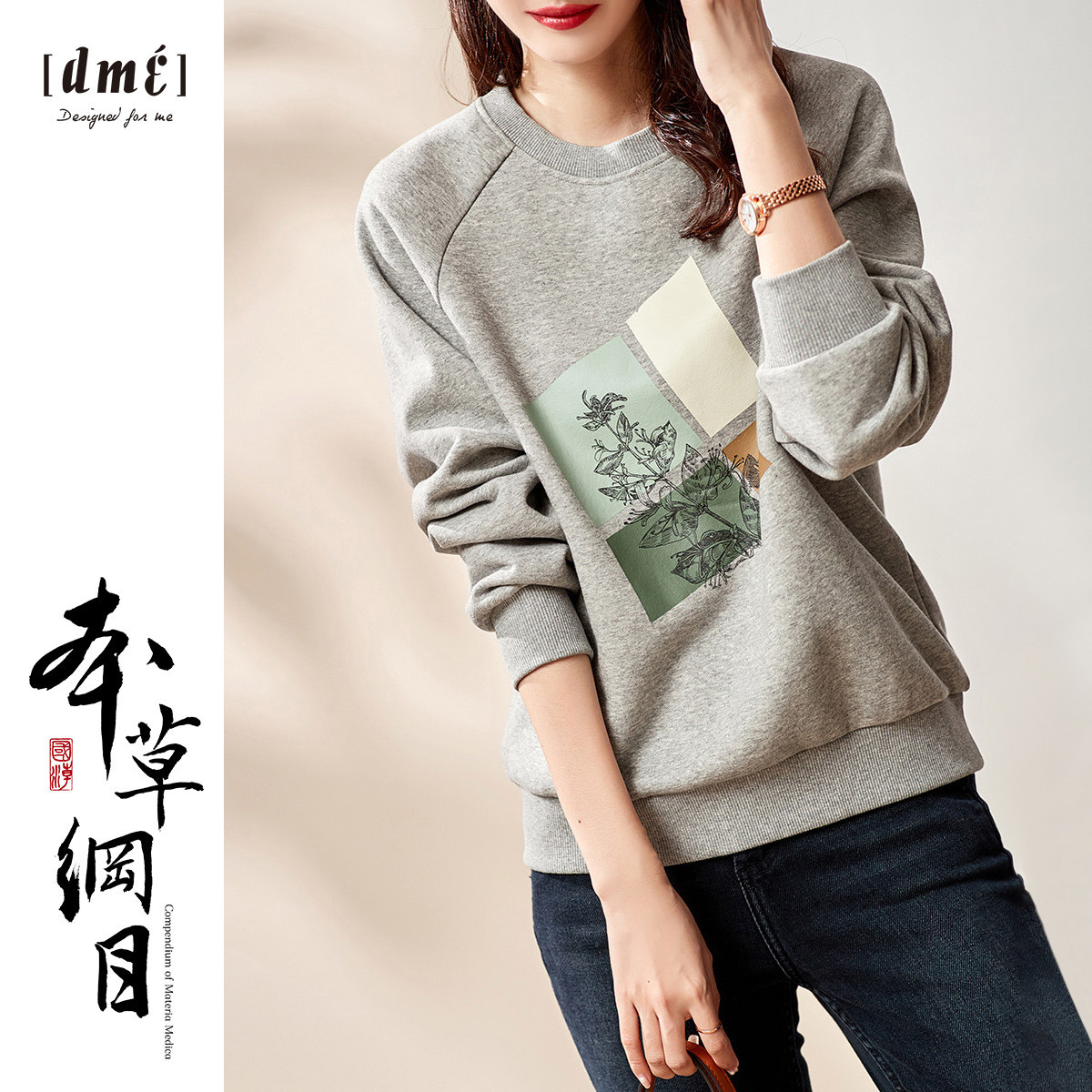 米子旗春秋季早春款圆领印花卫衣慵懒宽松长袖上衣女 172506