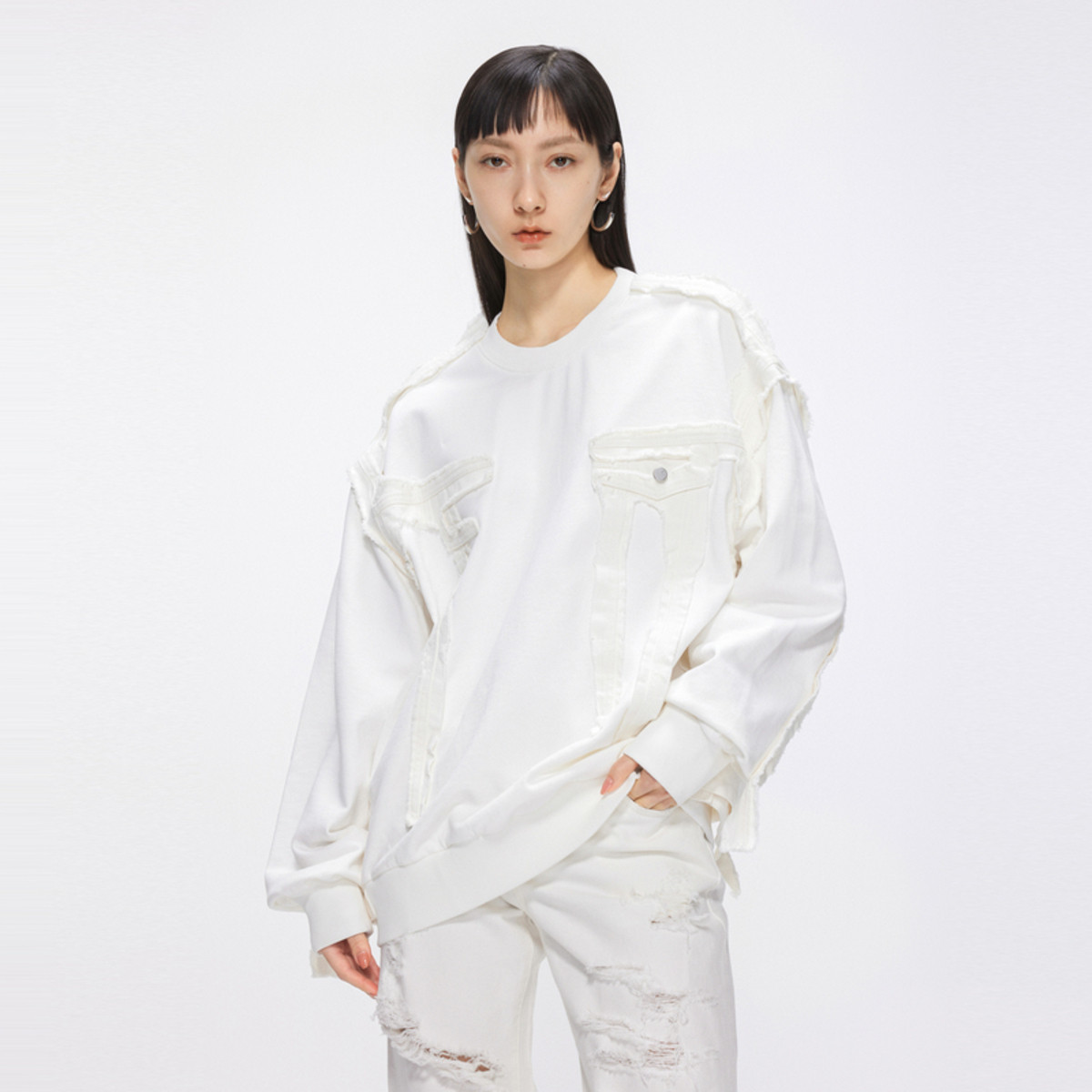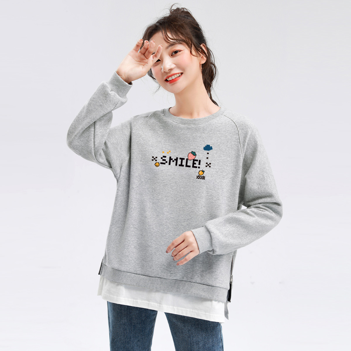 米子旗女式卫衣春秋款字母印花日系风格假两件侧边开叉外套上衣女 018330