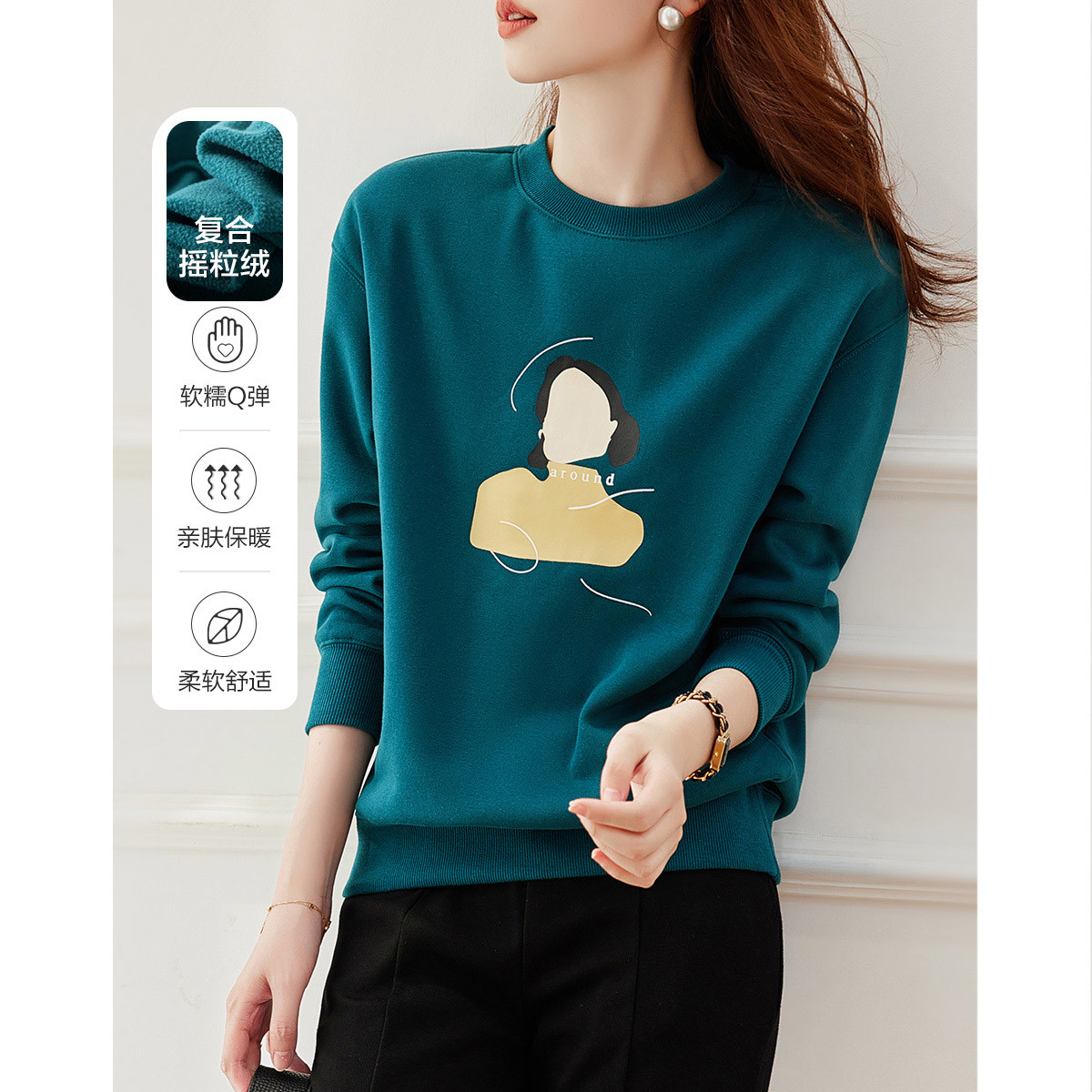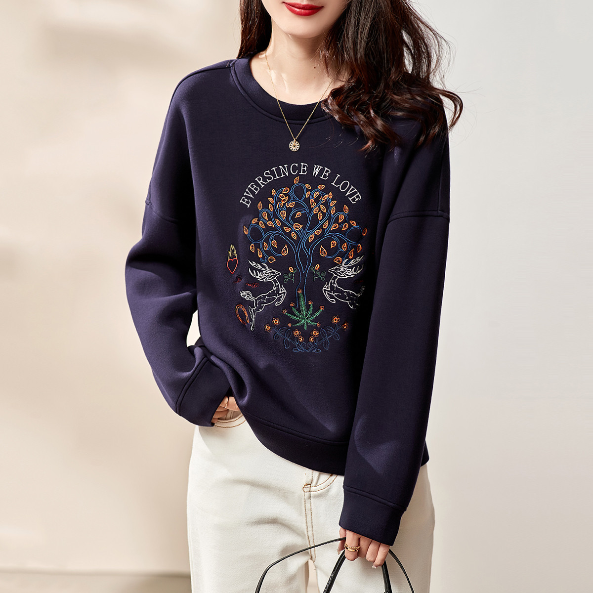 【麋鹿刺绣】春秋空气层圆领套头女卫衣女士卫衣长袖女上衣女 933825