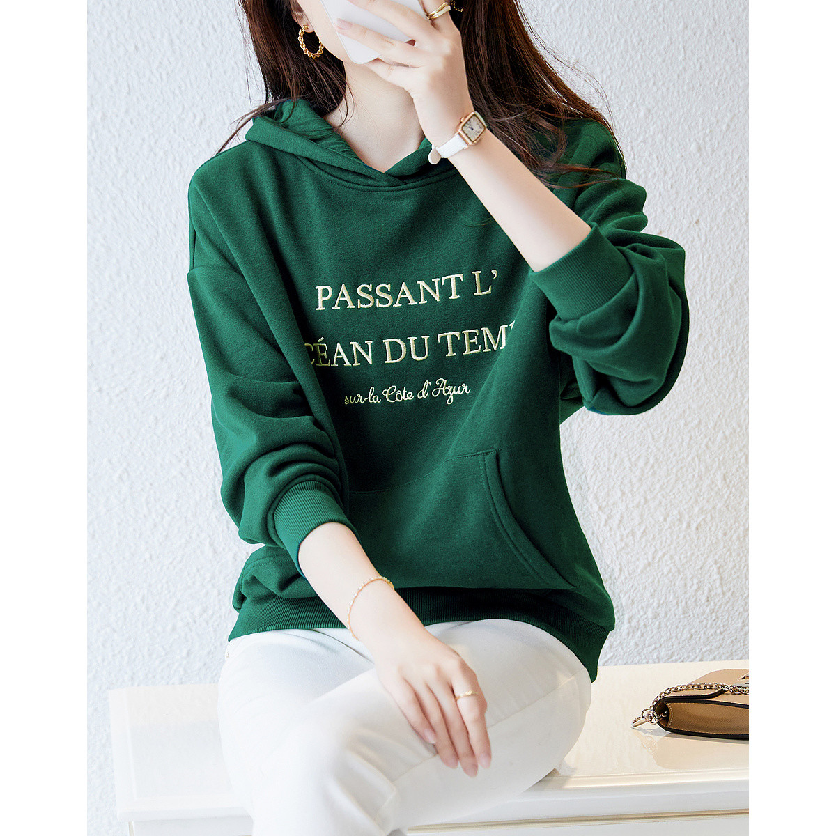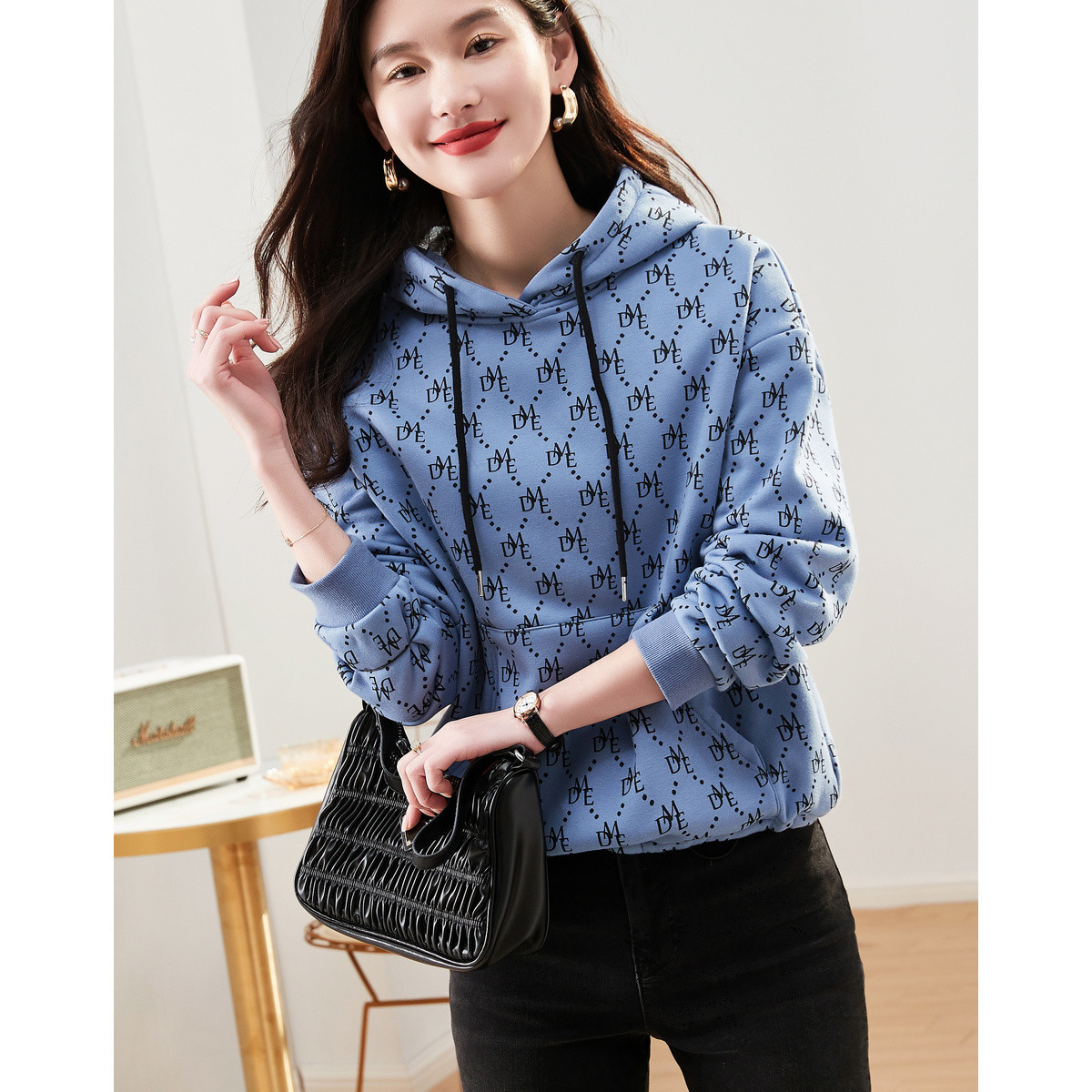 【字母印花卫衣】秋季通勤连帽落肩印花长袖微弹宽松卫衣女 124097