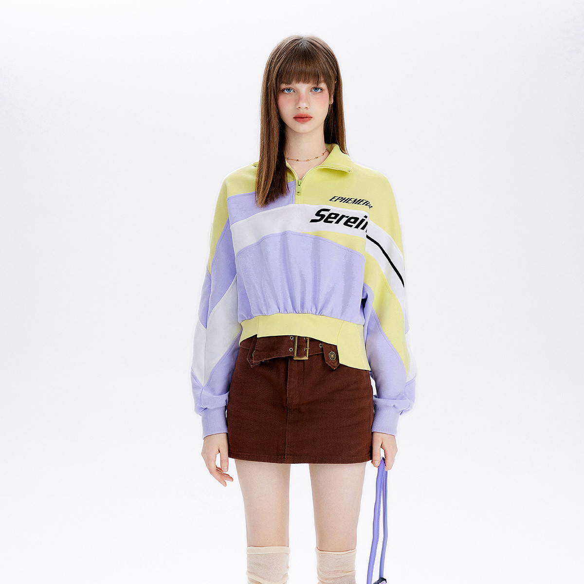 春秋polo领拉链卫衣女拼接复古设计小众短上衣 063764