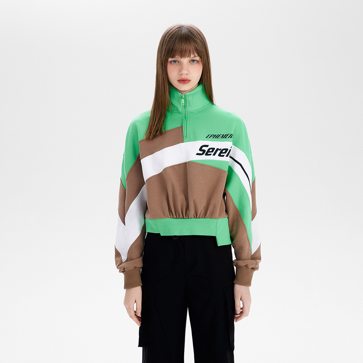【松驰感套头卫衣】秋浅豆绿帅气立领拉链半门襟简约卫衣 827586