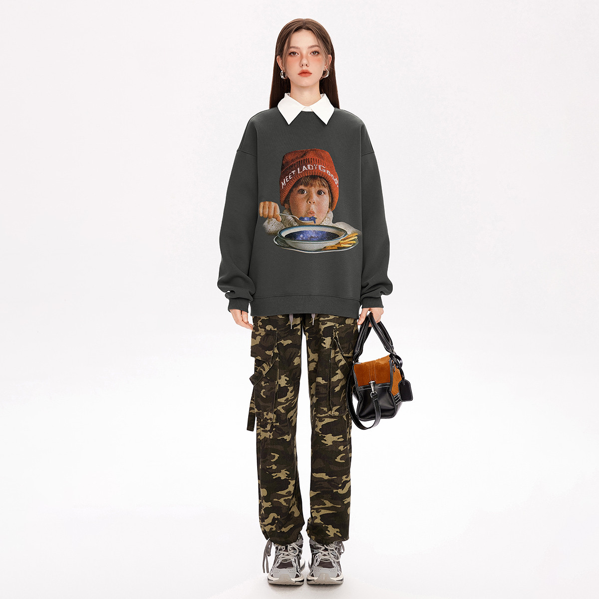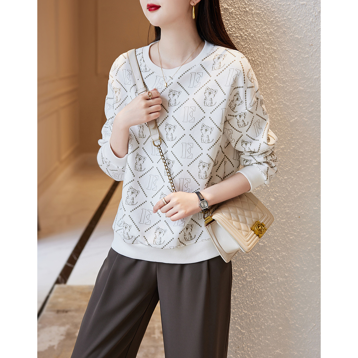 春秋复古印花oversize卫衣女圆领宽松上衣 293780