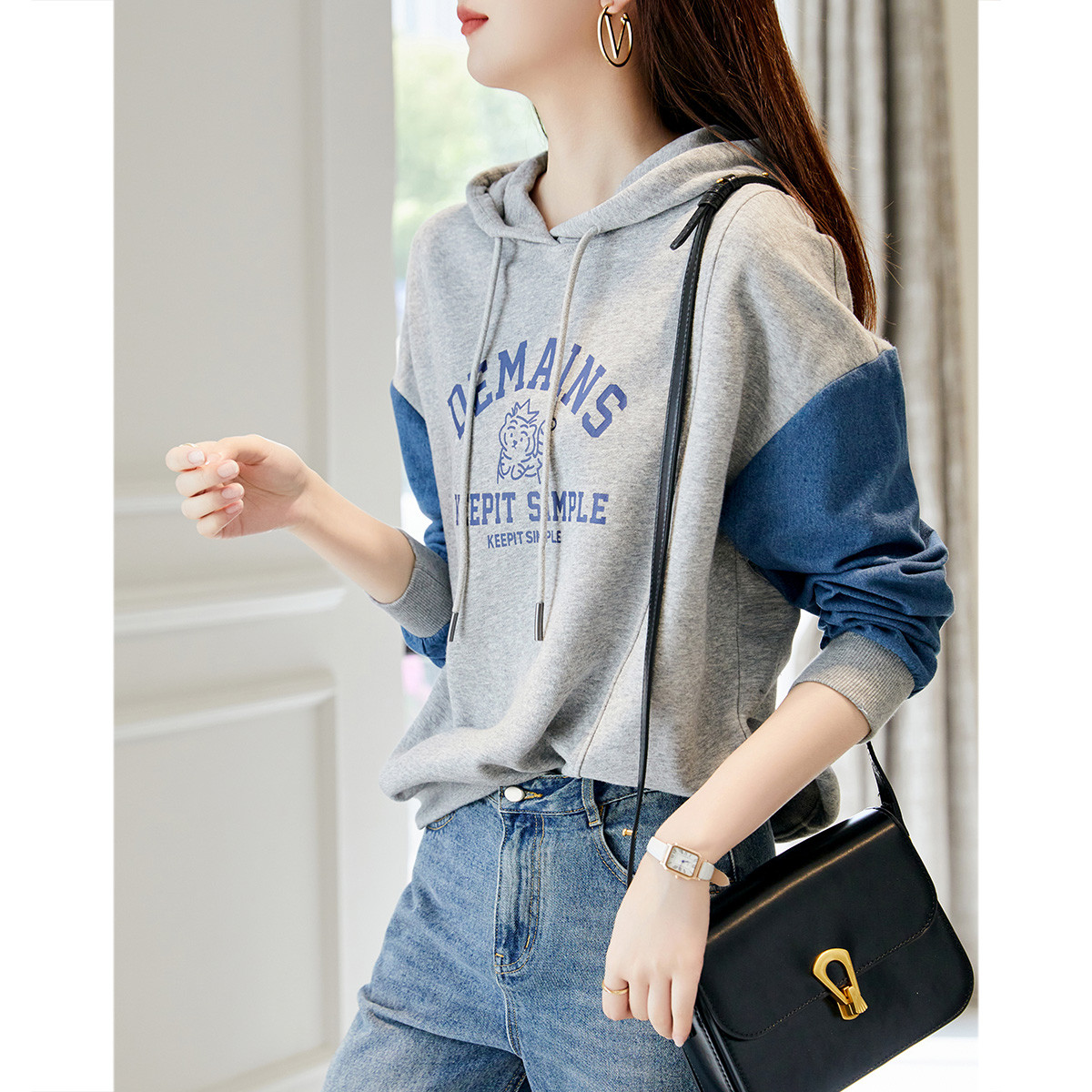 春秋拼接卫衣少女感小个子宽松圆领韩版上衣潮 385044
