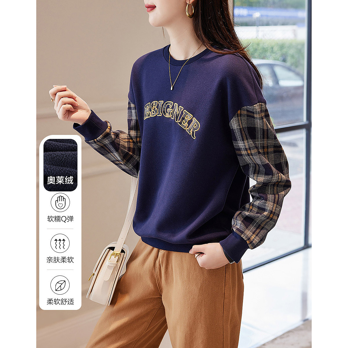 【贴布绣字母格纹拼接卫衣】秋圆领落肩长袖微弹女式卫衣 560001