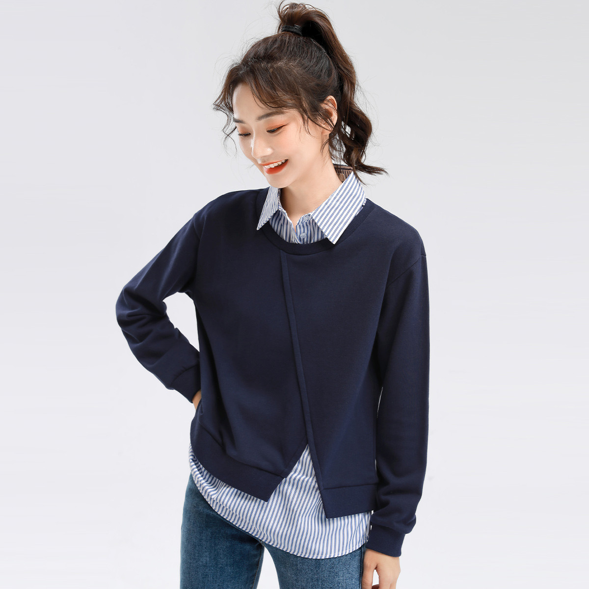 米子旗简约拼接假两件女式卫衣秋装通勤穿搭宽松长袖上衣 797914