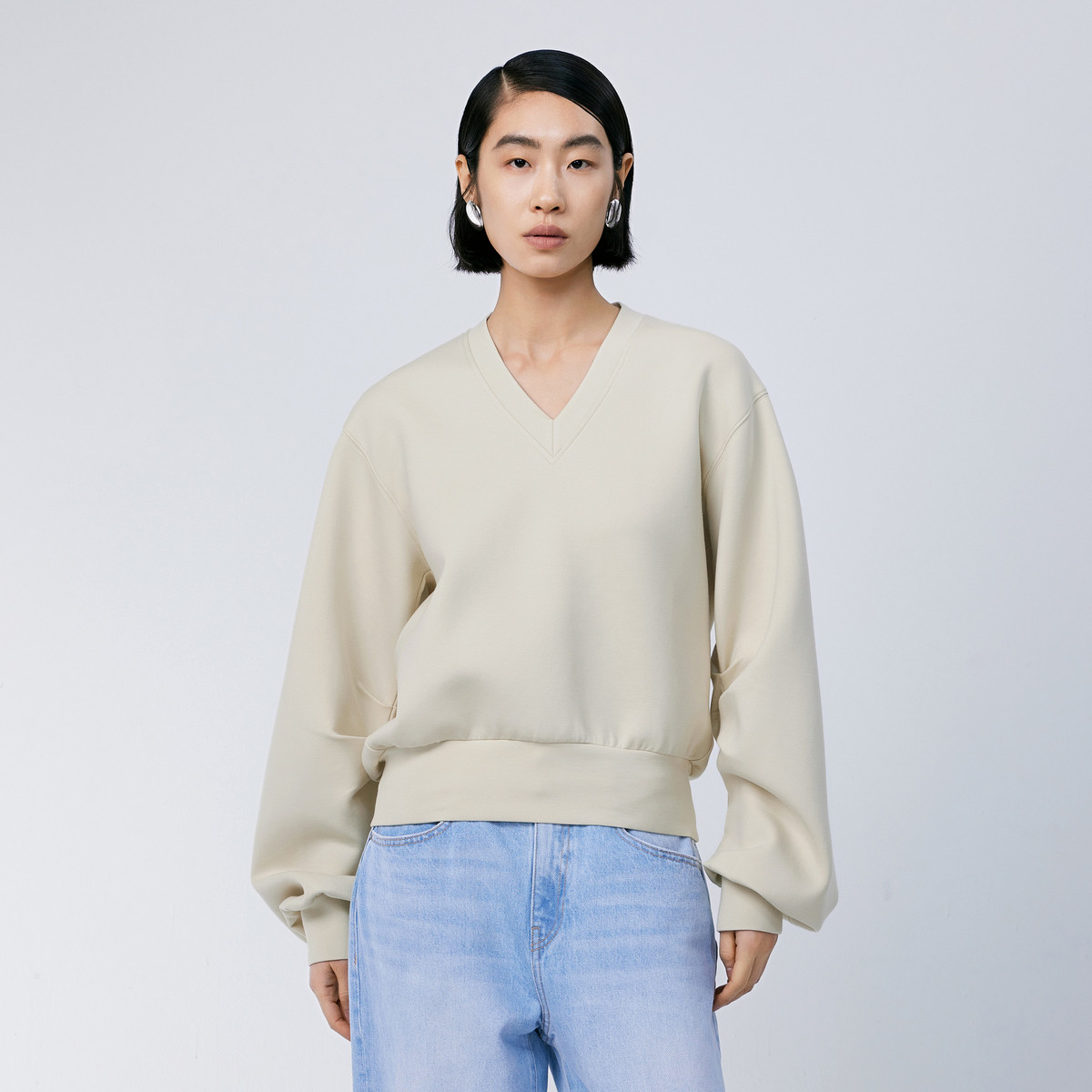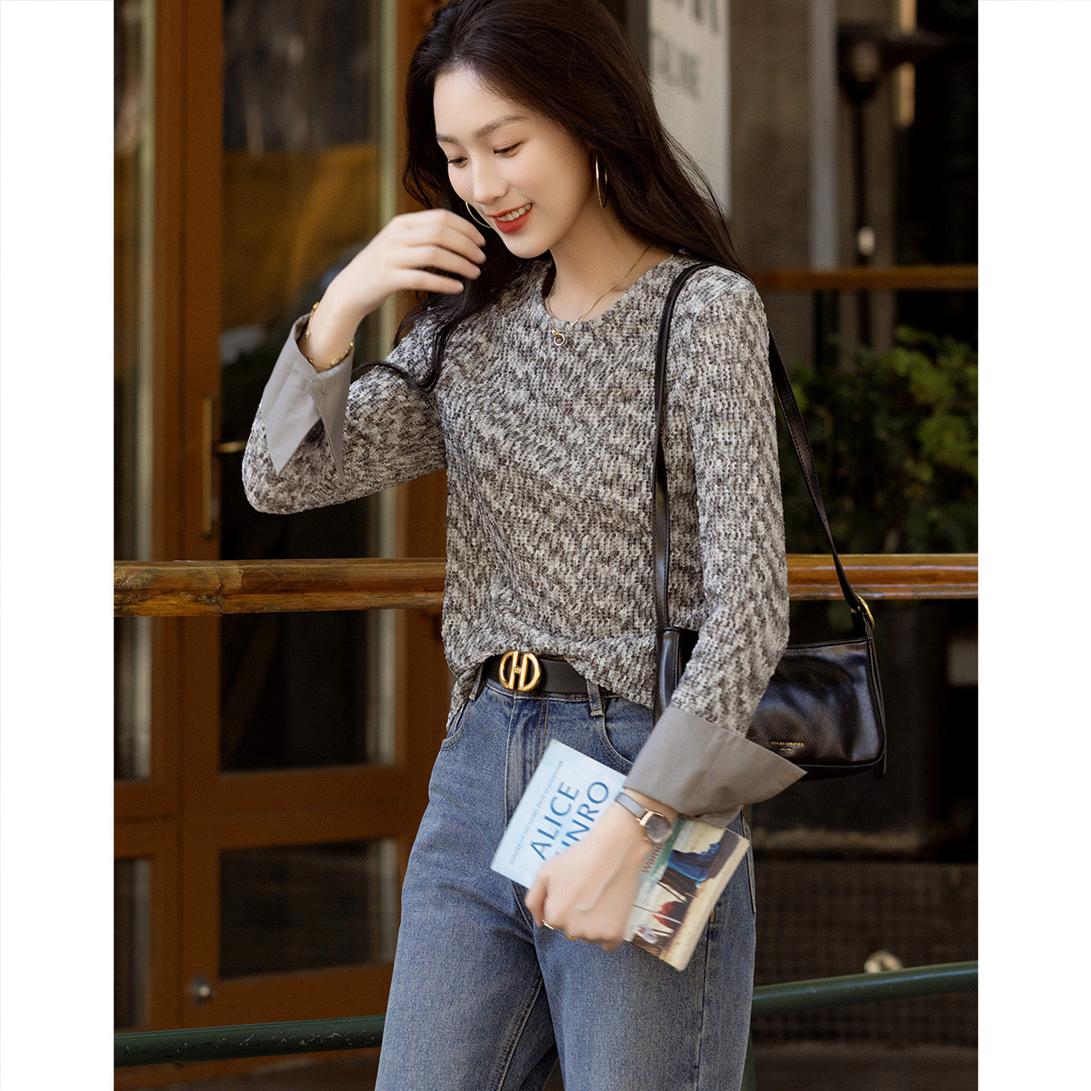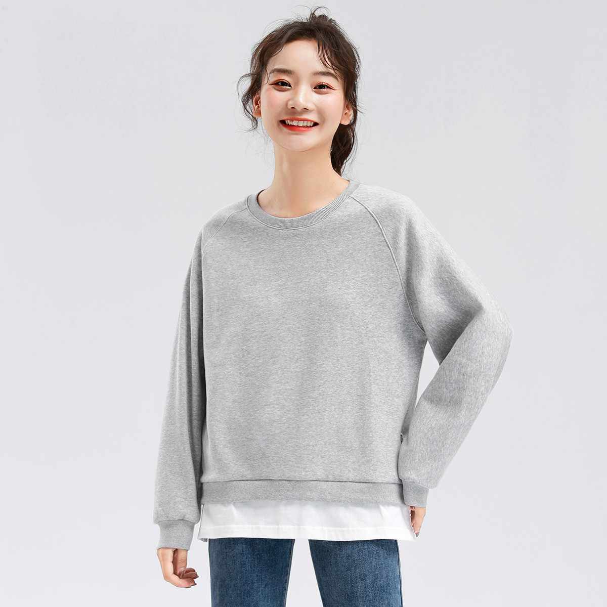 【浪漫主义】春季通勤风肌理感拼接袖口圆领卫衣舒适藏肉女式上衣 969601