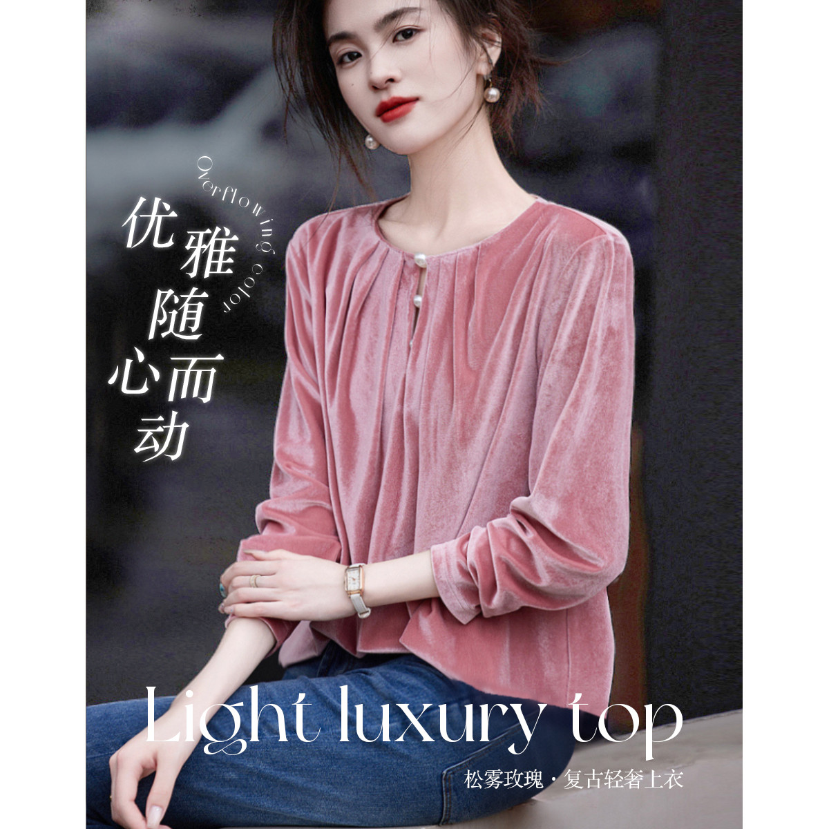 【松雾玫瑰】秋轻熟名媛风哑光丝绒上衣珍珠泡泡袖遮肉女式t恤 762305