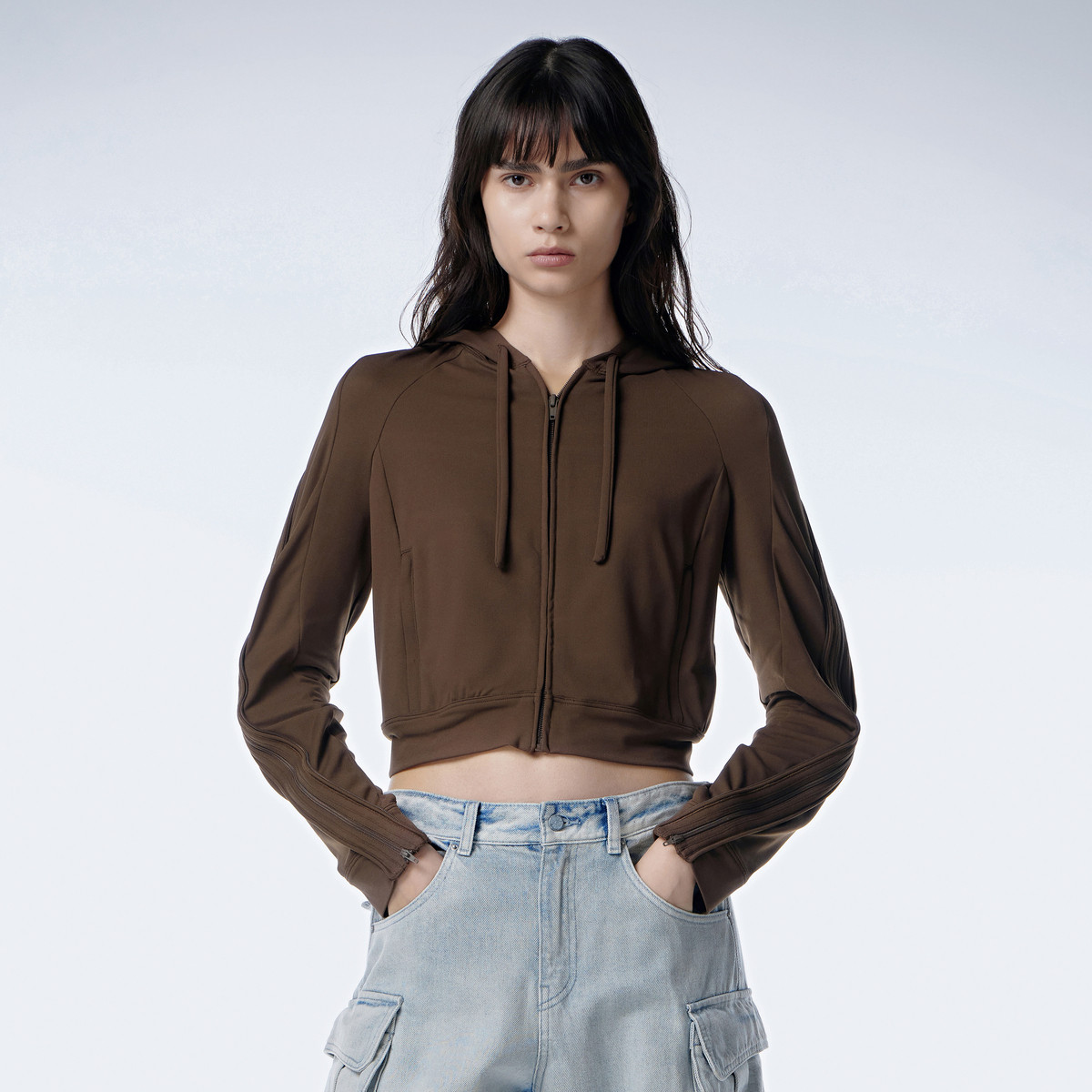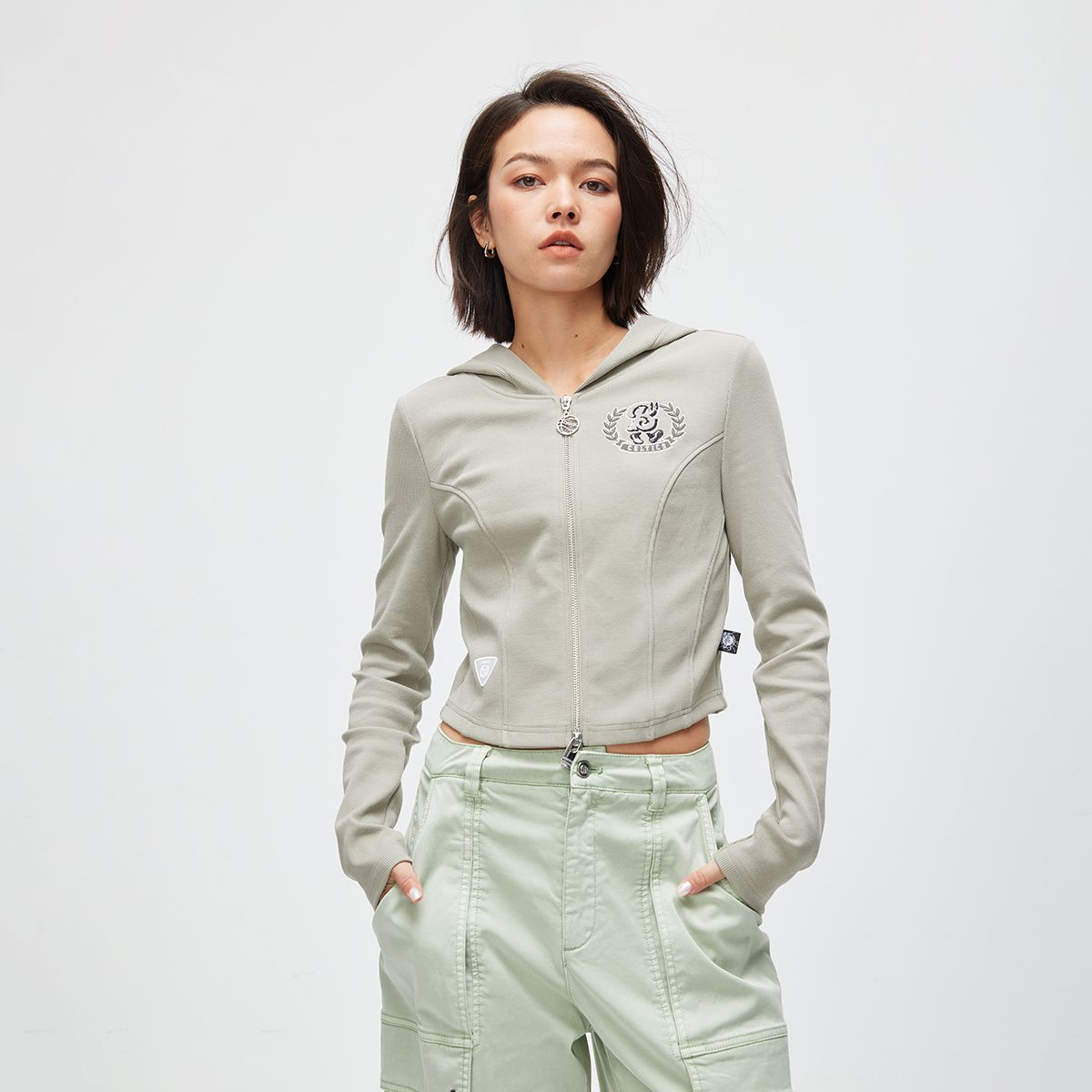 【潮流休闲】春季双向拉链口袋连帽短款卫衣女 193498