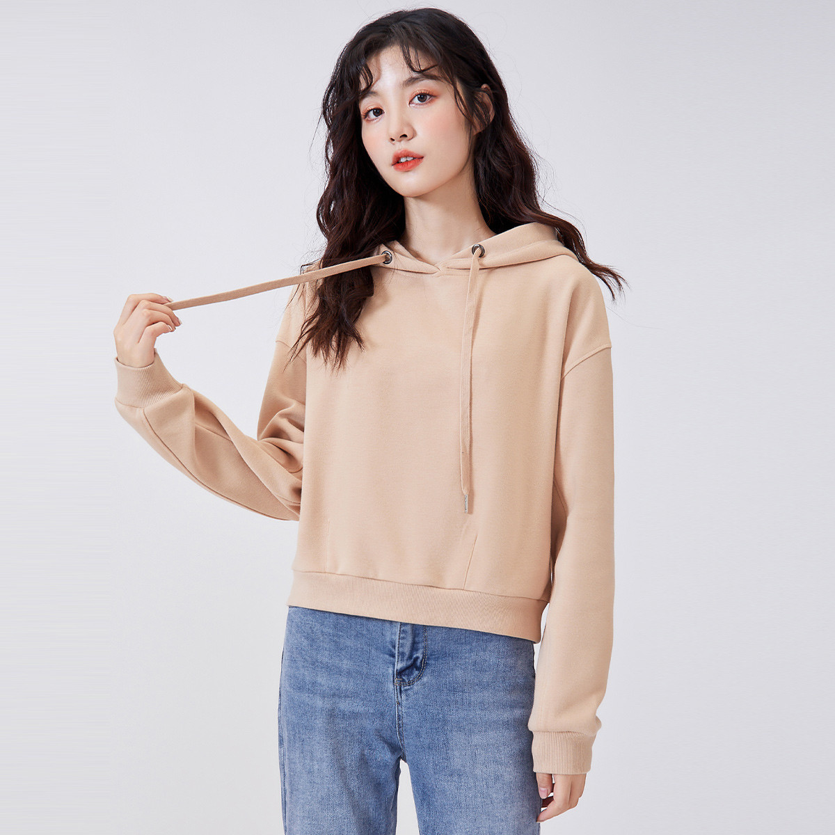 米子旗纯色简约连帽女式卫衣春秋季短款百搭小个子长袖上衣 523482