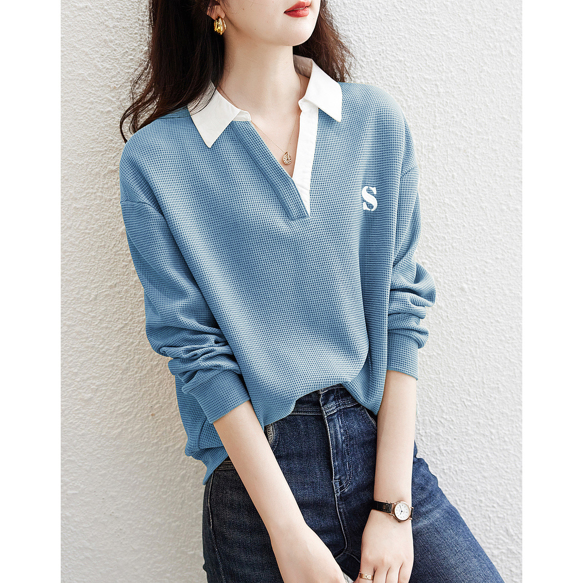 【华夫格拼接卫衣】春季学院风字母刺绣翻领宽松藏肉休闲女式上衣 375745