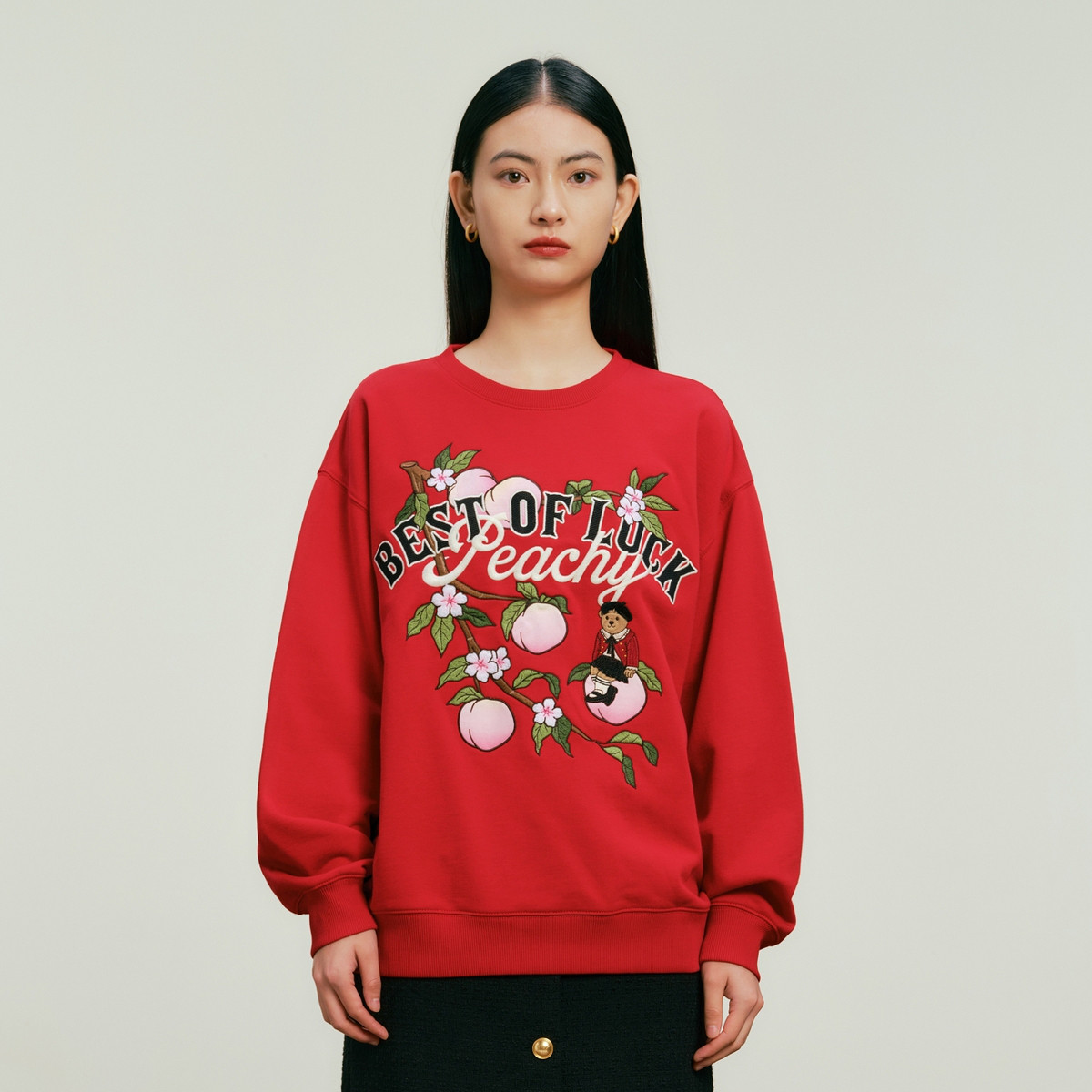 小熊春秋款桃运满满红色圆领宽松卫衣上衣女 534913