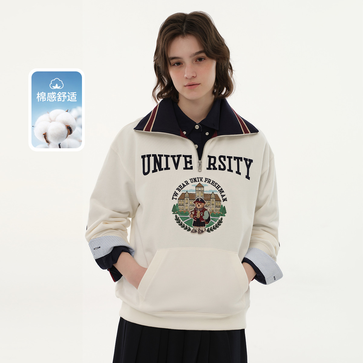 小熊拉链翻领卫衣磨毛感美式复古宽松落肩上衣 835009