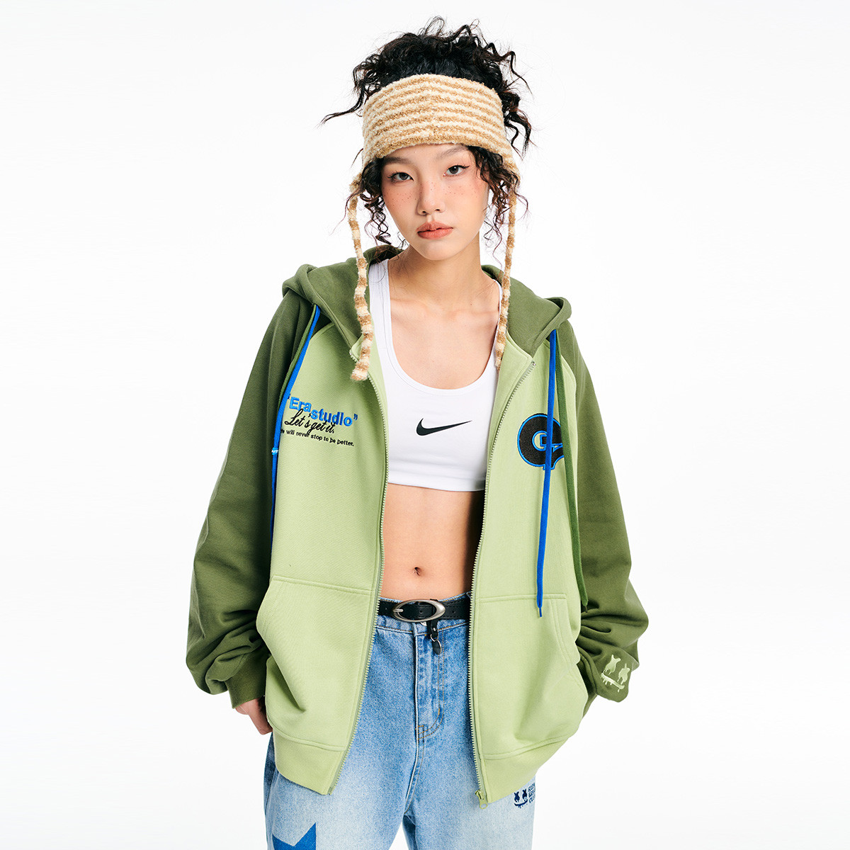 撞色拼接开衫连帽卫衣春秋季休闲情侣帽衫潮牌宽松上衣男女同款 061207