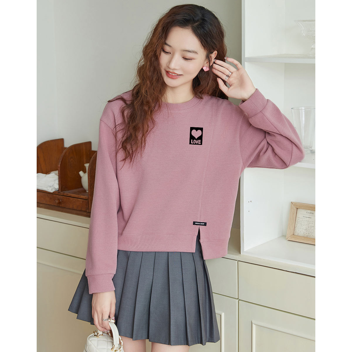 米子旗春秋季圆领爱心印花卫衣女下摆开叉短款宽松长袖上衣 355226