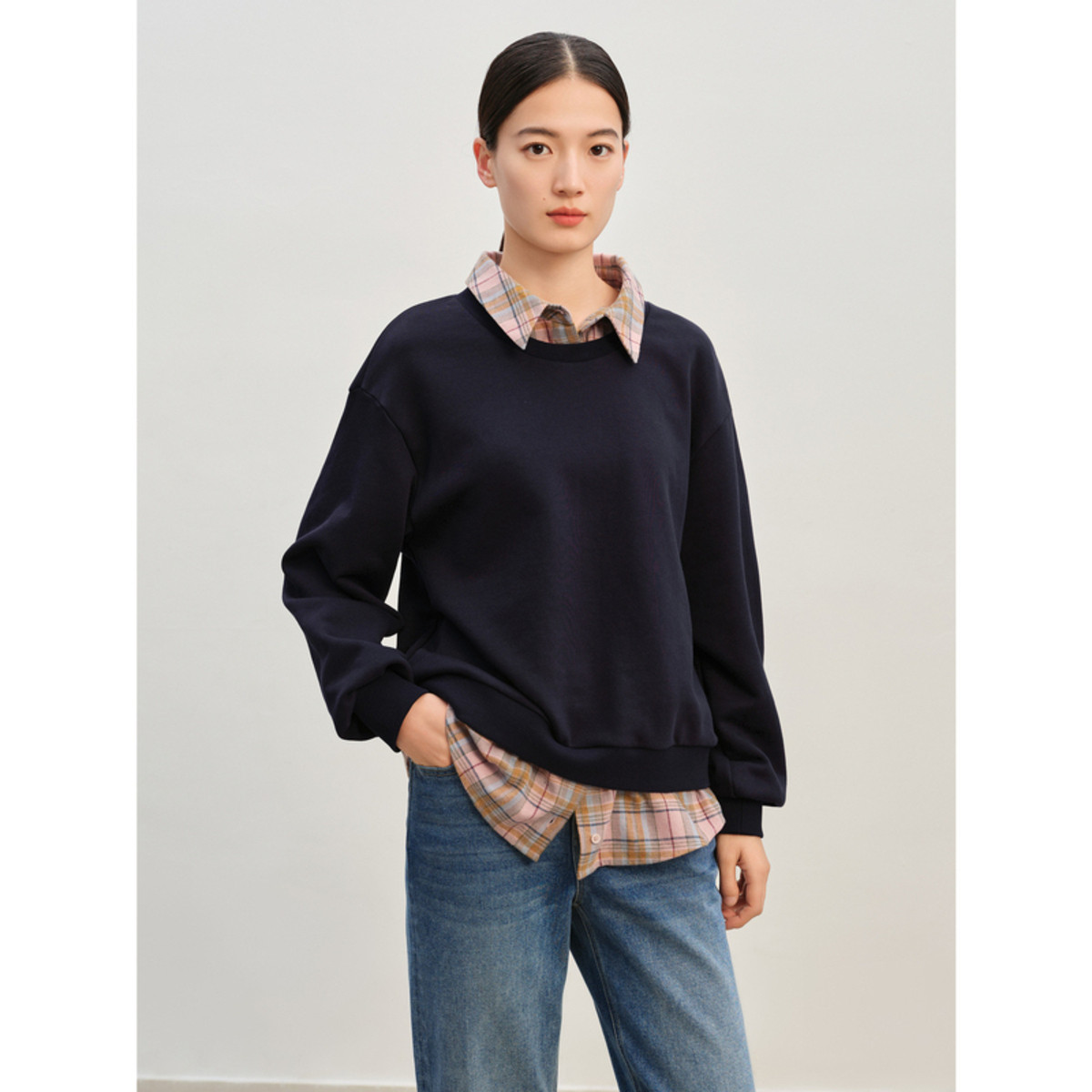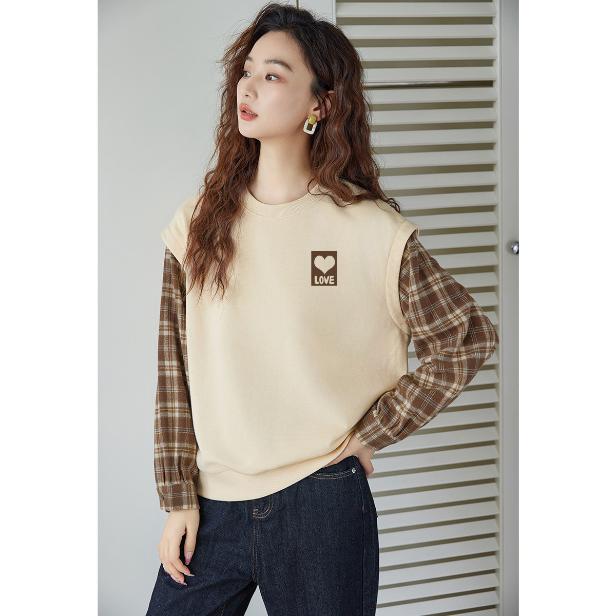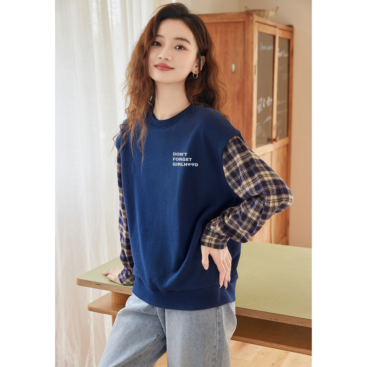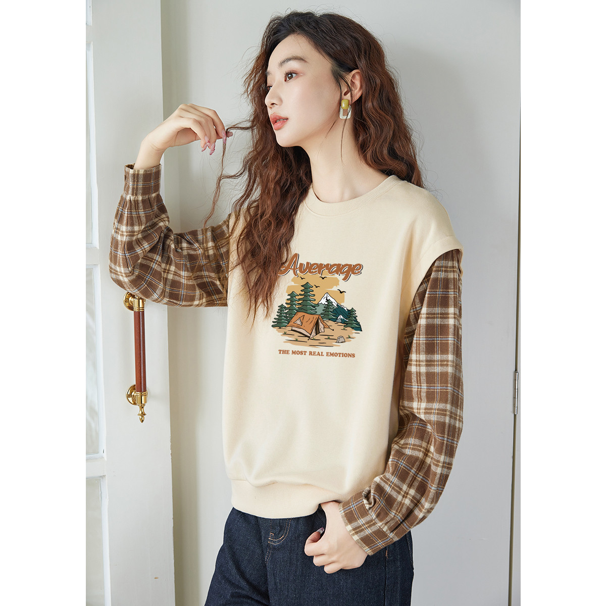 米子旗春秋款圆领假两件卫衣女宽松休闲长袖上衣 242586