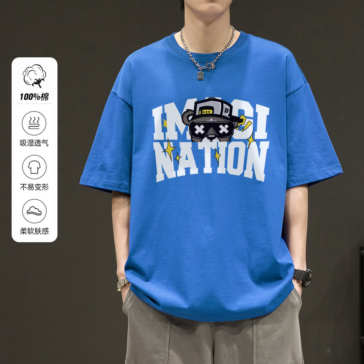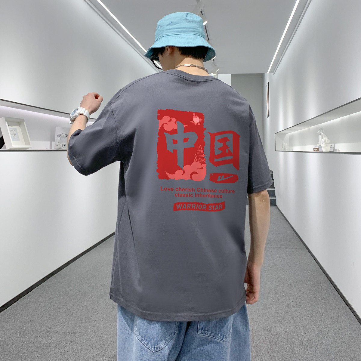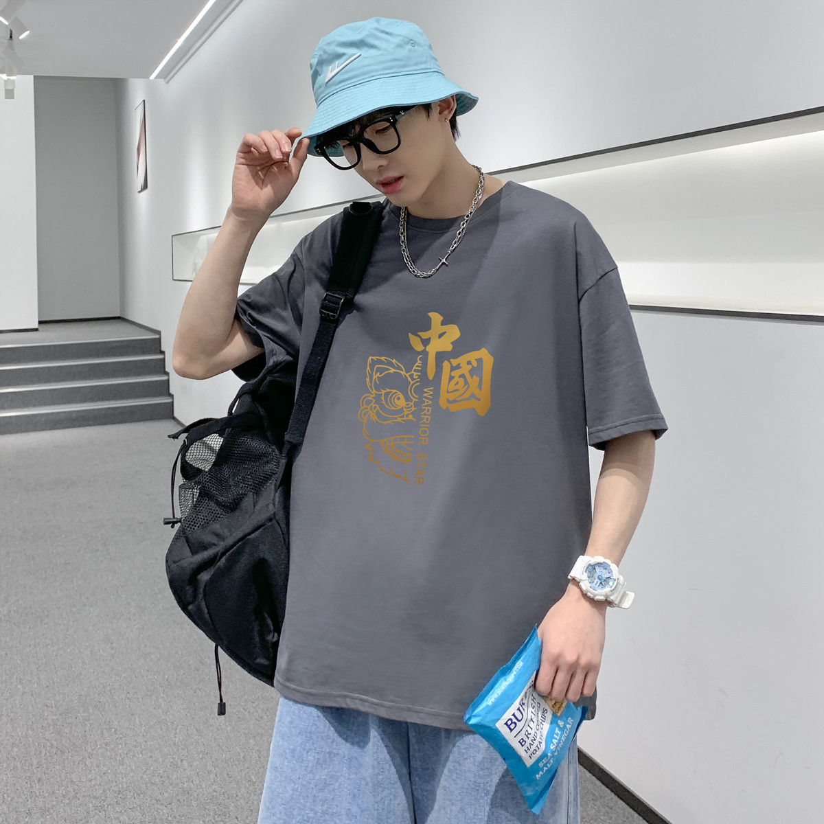 【100%纯棉】国潮复古风夏季宽松潮牌高街帅气男生短袖t恤衫 457555