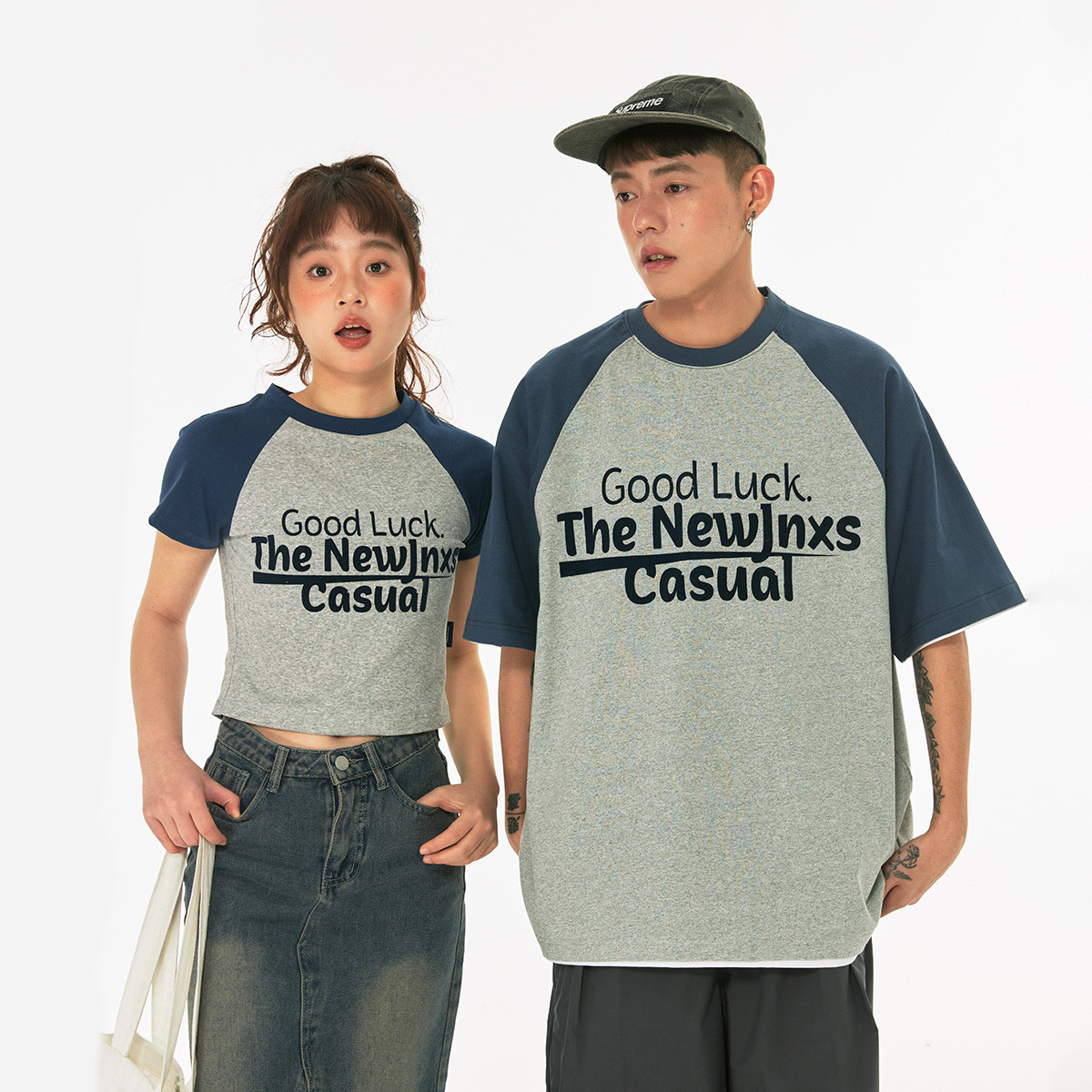 江南先生美式植绒印花长短款插肩袖情侣装短袖t恤男夏季辣妹风tee 176977