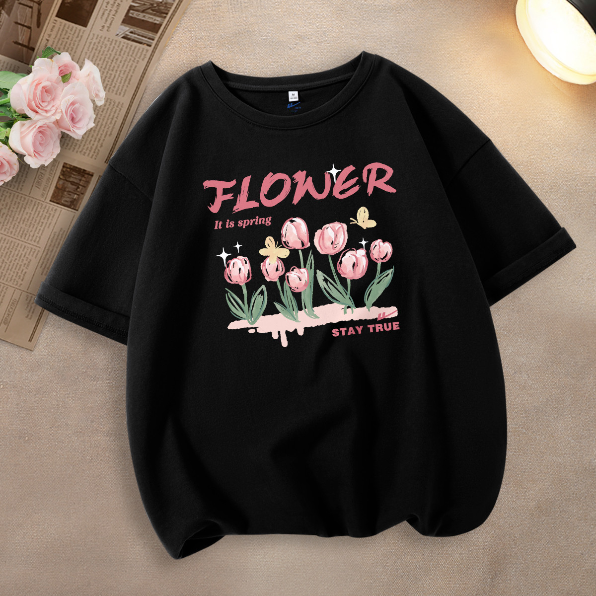 【女装重磅棉】夏季女式宽松运动T恤纯棉透气打底大码印花上衣 053075