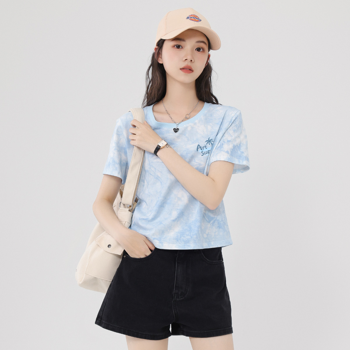 【女装100%棉】夏季扎染短袖纯棉女式T恤短款高腰显瘦设计感 421651
