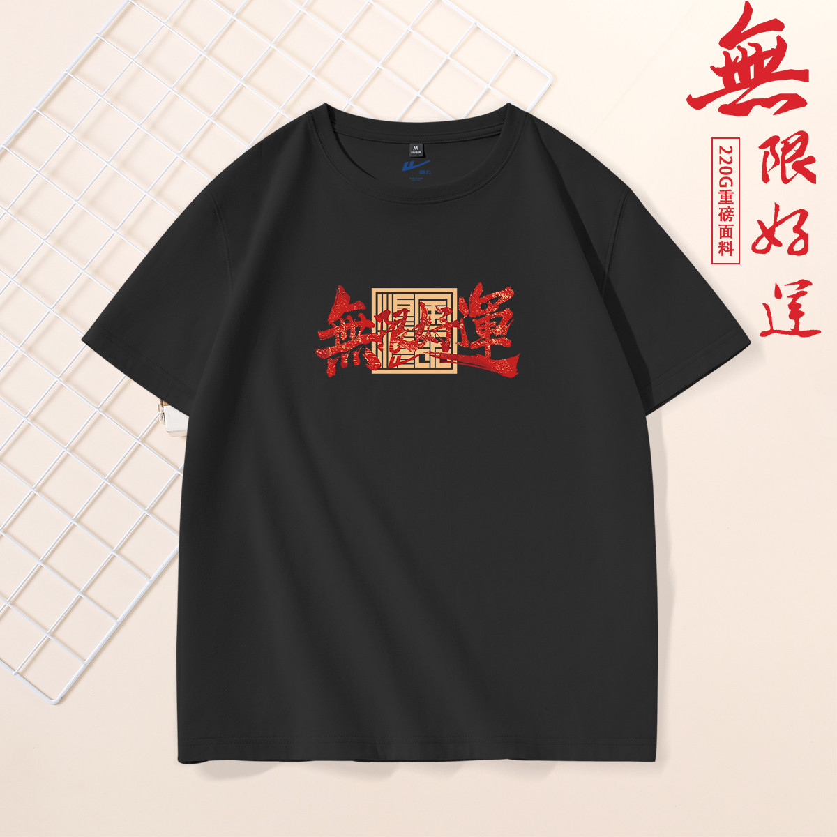 【重磅纯棉】国潮短袖t恤男夏季宽松透气男女同款无限好运半袖 055571
